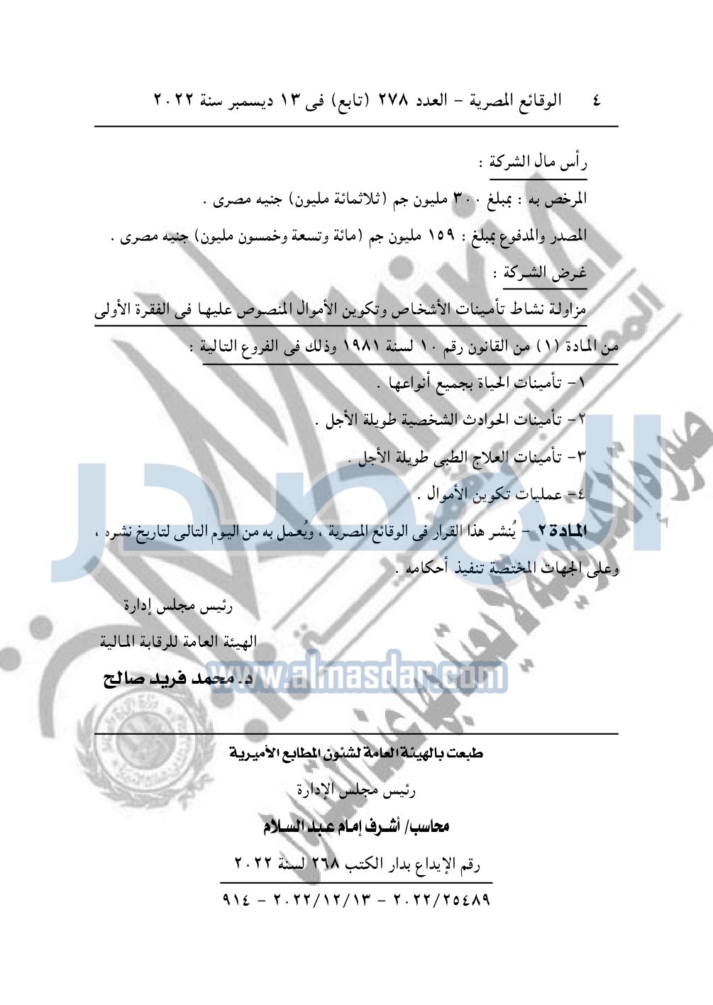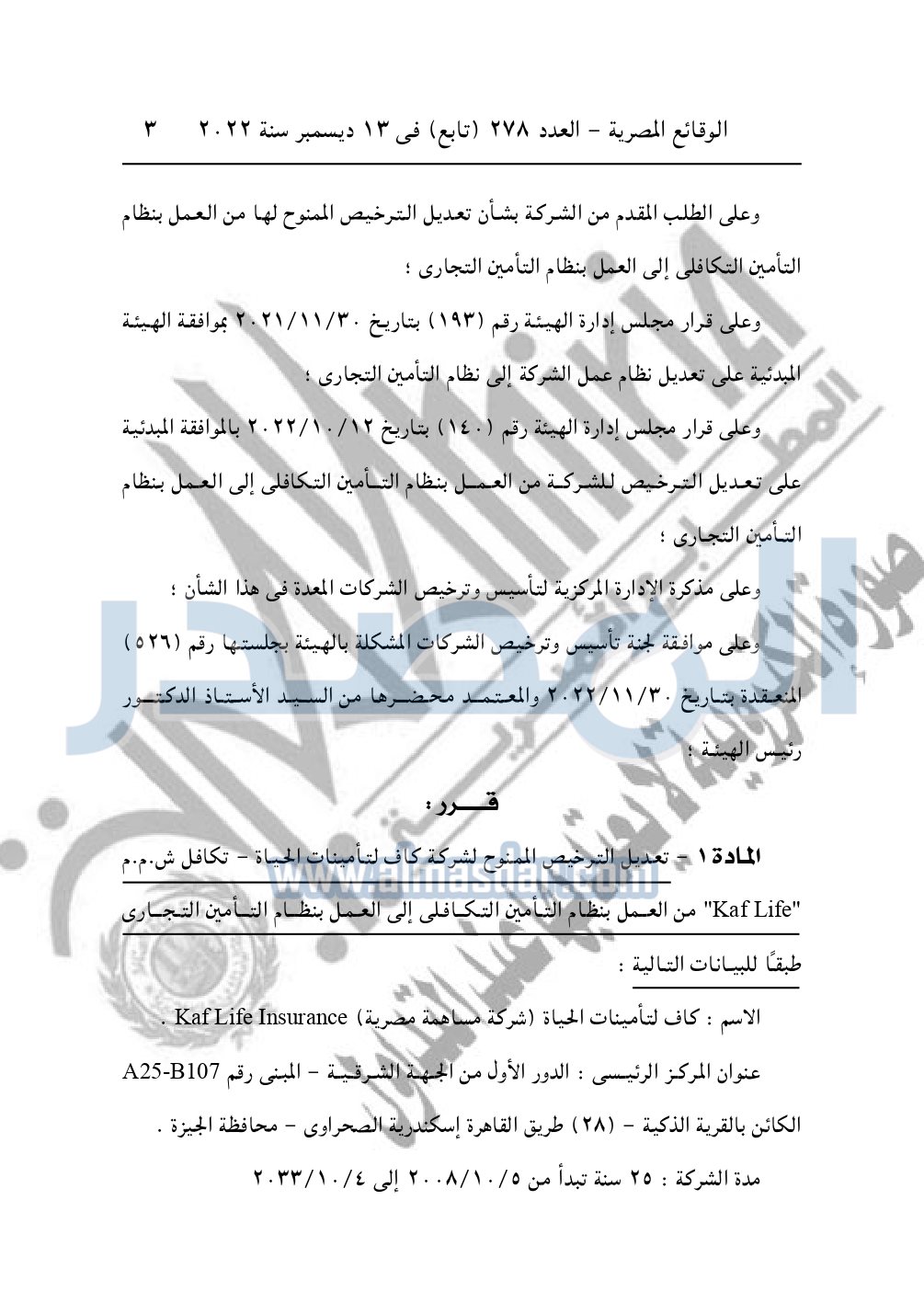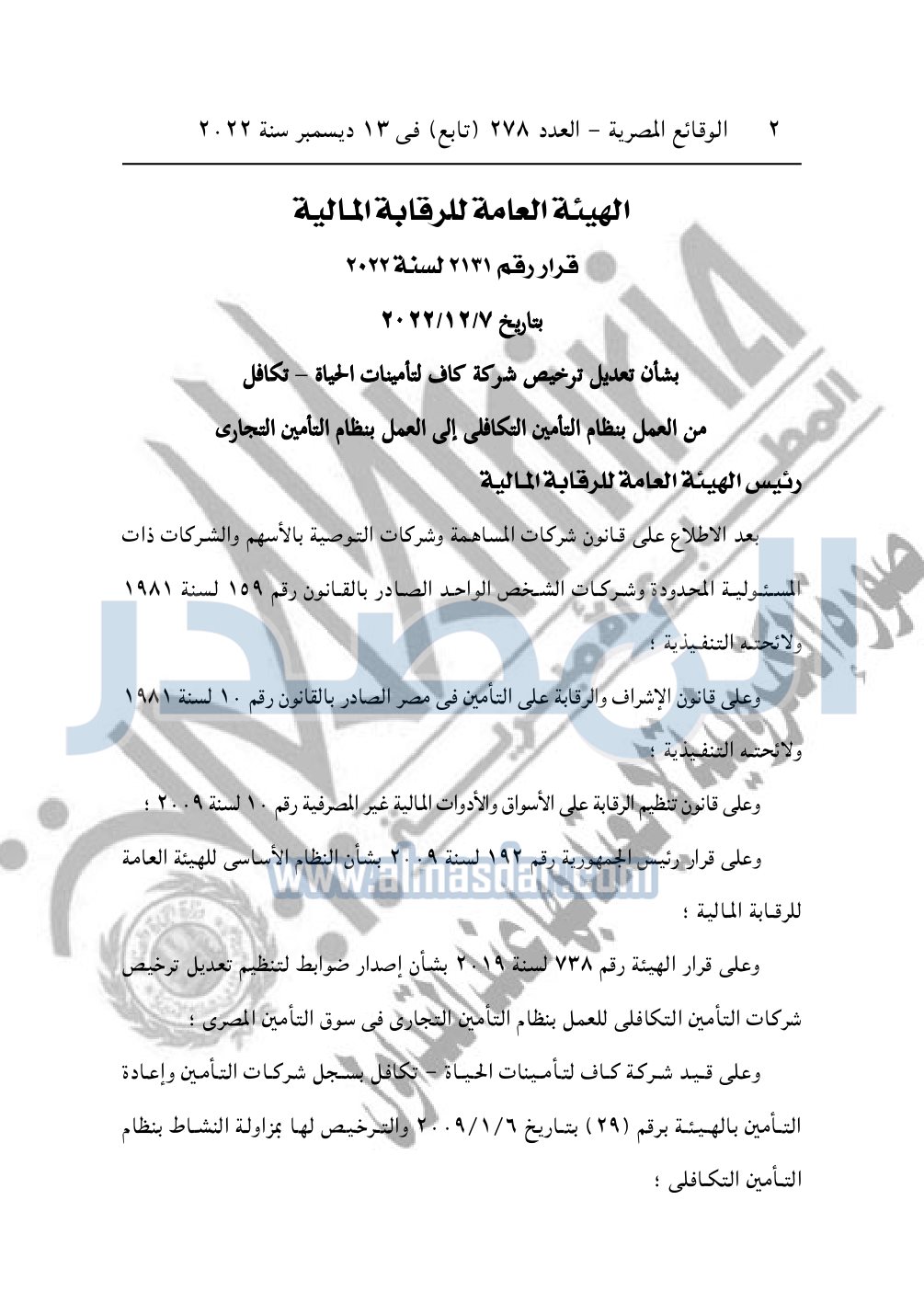 نشرت الوقائع المصرية في العدد 278 "تابع"، بتاريخ 13 ديسمبر 2022، قرار مجلس إدارة الهيئة العامة للرقابة المالية رقم 2131 لسنة 2022 بتاريخ 7-12-2022، بشأن تعديل ترخيص شركة كاف لتأمينات الحياة – تكافل من العمل بنظام التأمين التكافلى إلى العمل بنظام التأمين التجارى. وفيما يلى نص القرار: