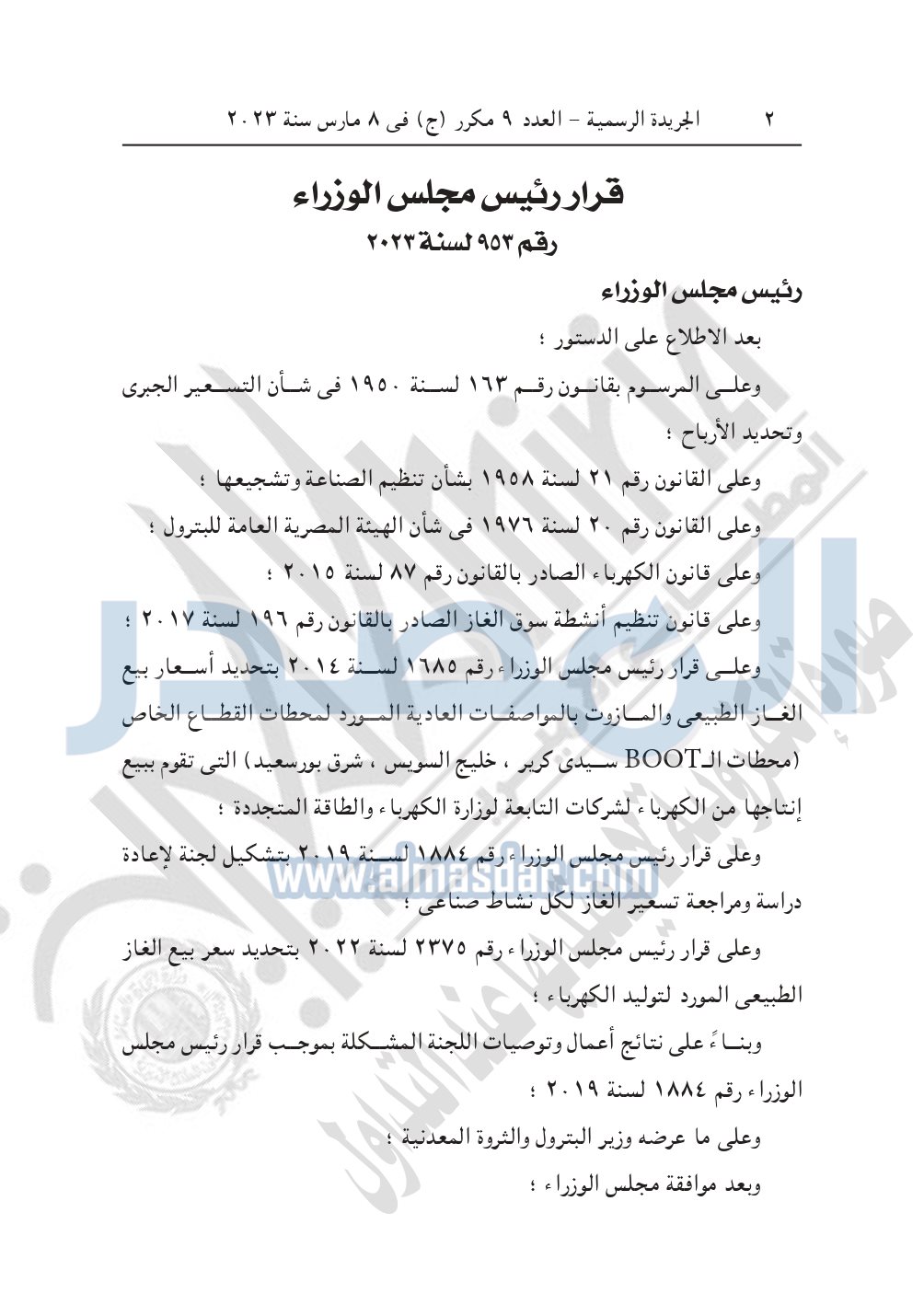 "يحدد سعر بيع الغاز الطبيعى المورد لتوليد الكهرباء بـ"3" دولارات – مليون وحدة حرارية بريطانية لشركات إنتاج الكهرباء التابعة لوزارة الكهرباء والطاقة المتجددة.