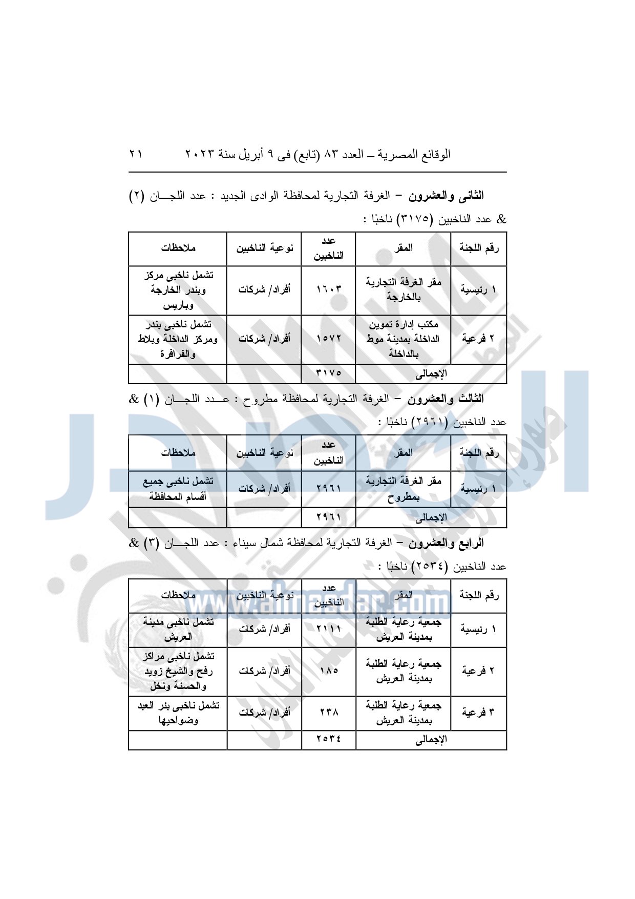 نشرت الوقائع المصرية في العدد 83 "تابع"، بتاريخ 9 أبريل 2023، قرار وزارة التجارة والصناعة رقم 109 لسنة 2023، بشأن فتح باب تقديم طلبات الترشيح لانتخابات أعضاء مجالس إدارة الغرف التجارية يوم الخميس الموافق 13 أبريل 2023 ولمدة خمسة أيام عمل متتالية مع مراعاة الأجازات الرسمية، وتقدم الطلبات يومياً من الساعة الثامنة صباحاً وحتى انتهاء مواعيد العمل الرسمية.