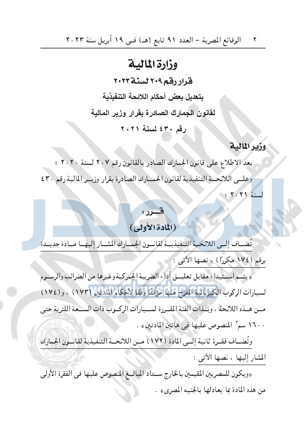 نشرت الوقائع المصرية في العدد 91 تابع "هـ"، بتاريخ 19 أبريل 2023، قرار وزارة المالية رقم 209 لسنة 2023، بشأن تعديل بعض أحكام اللائحة التنفيذية لقانون الجمارك الصادرة بقرار وزير المالية.
