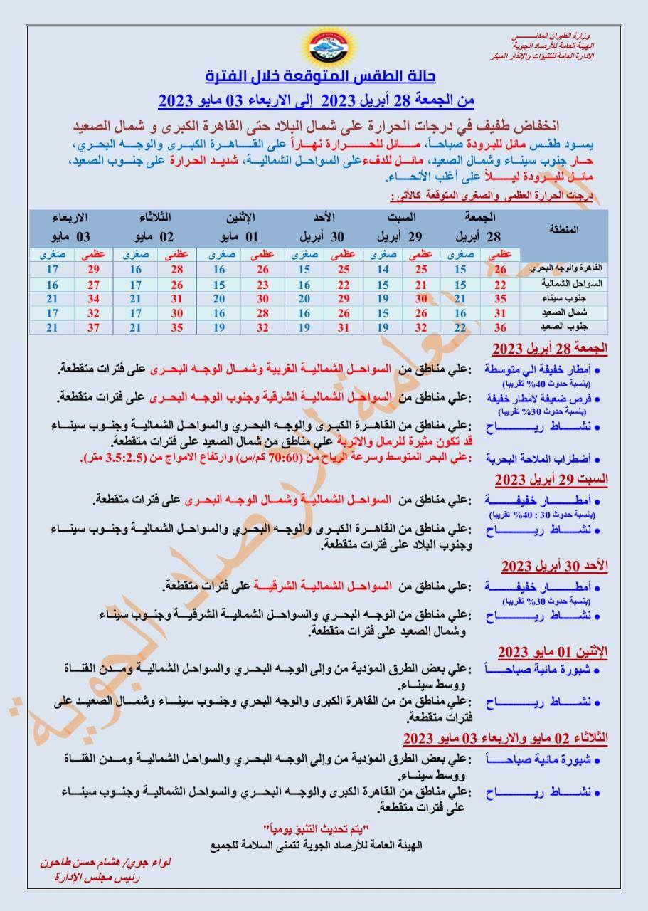 ويتوقع الخبراء نشاط الرياح على مناطق من القاهرة الكبرى والوجه البحري والسواحل الشمالية وجنوب سيناء قد تكون مثيرة للرمال والأتربة على مناطق من شمال الصعيد والقاهرة على فترات متقطعة.