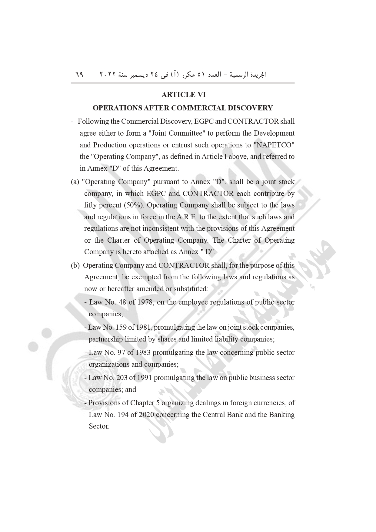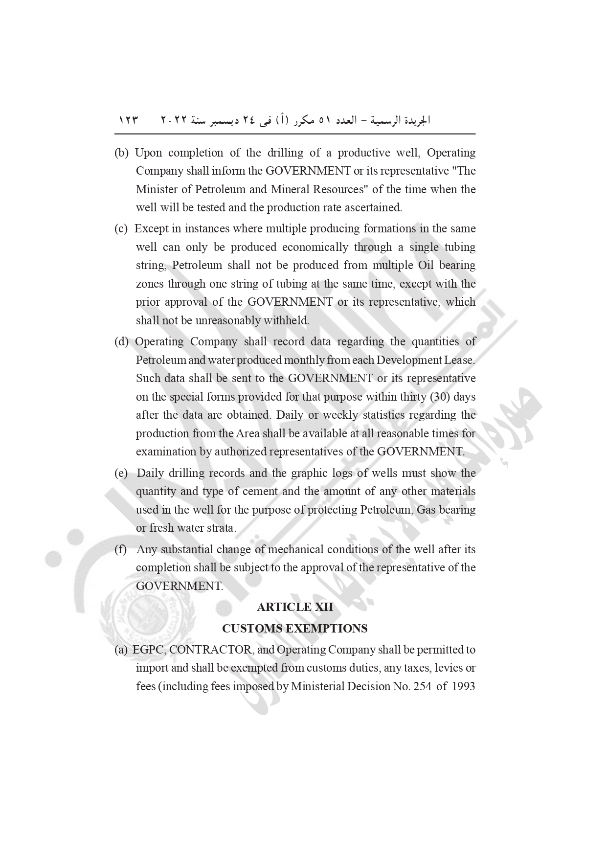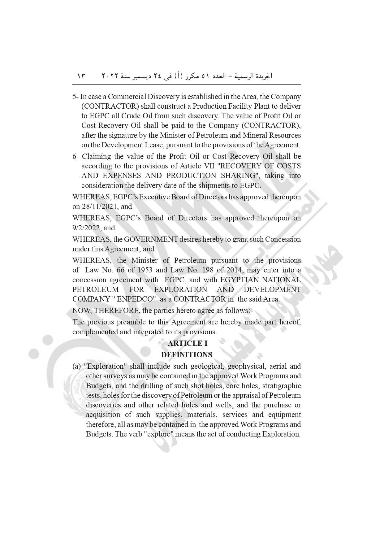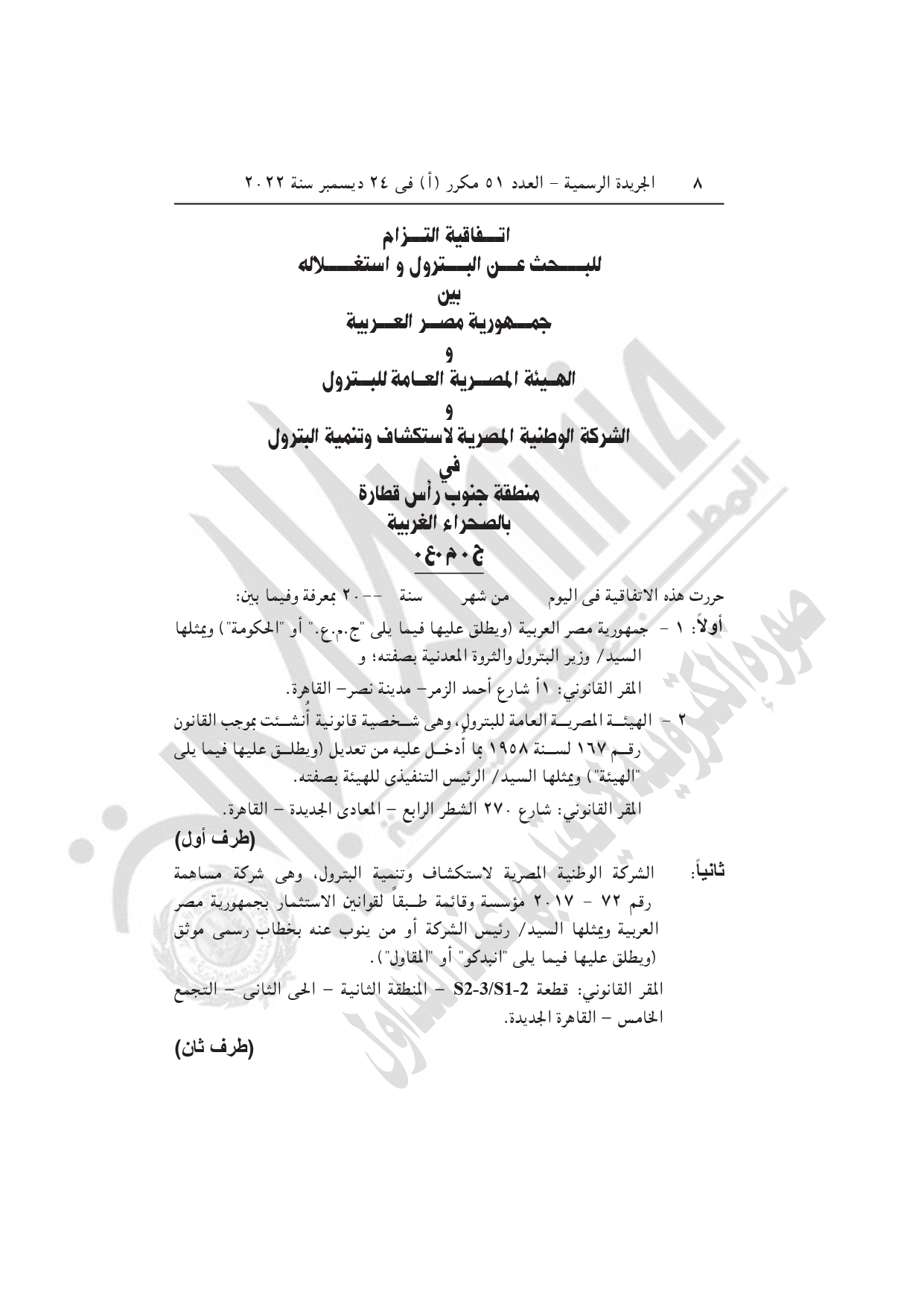نشرت الجريدة الرسمية في العدد 52 مكرر "أ"، بتاريخ 24 ديسمبر 2022، قرار رئيس جمهورية مصر العربية بالتصديق على القانون رقم 169 لسنة 2022، بشأن أن يرخص لوزير البترول والثروة المعدنية فى التعاقد مع الهيئة المصرية العامة للبترول والشركة الوطنية المصرية لاستكشاف وتنمية البترول للبحث عن البترول واستغلاله فى منطقة جنوب رأس قطارة بالصحراء الغربية "ج.م.ع"، وذلك وفقاً لأحكام الاتفاقية المرافقة والخريطة الملحقة بها.
