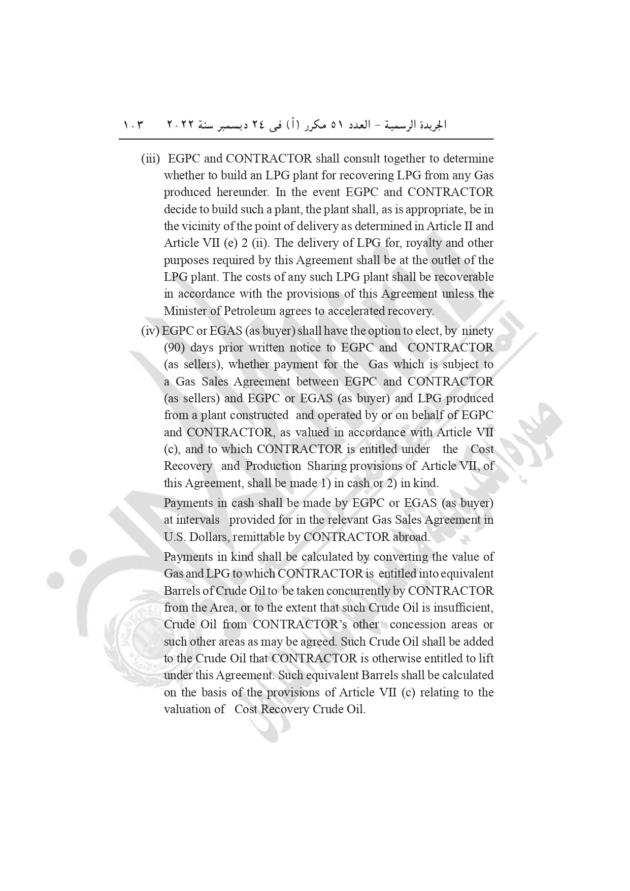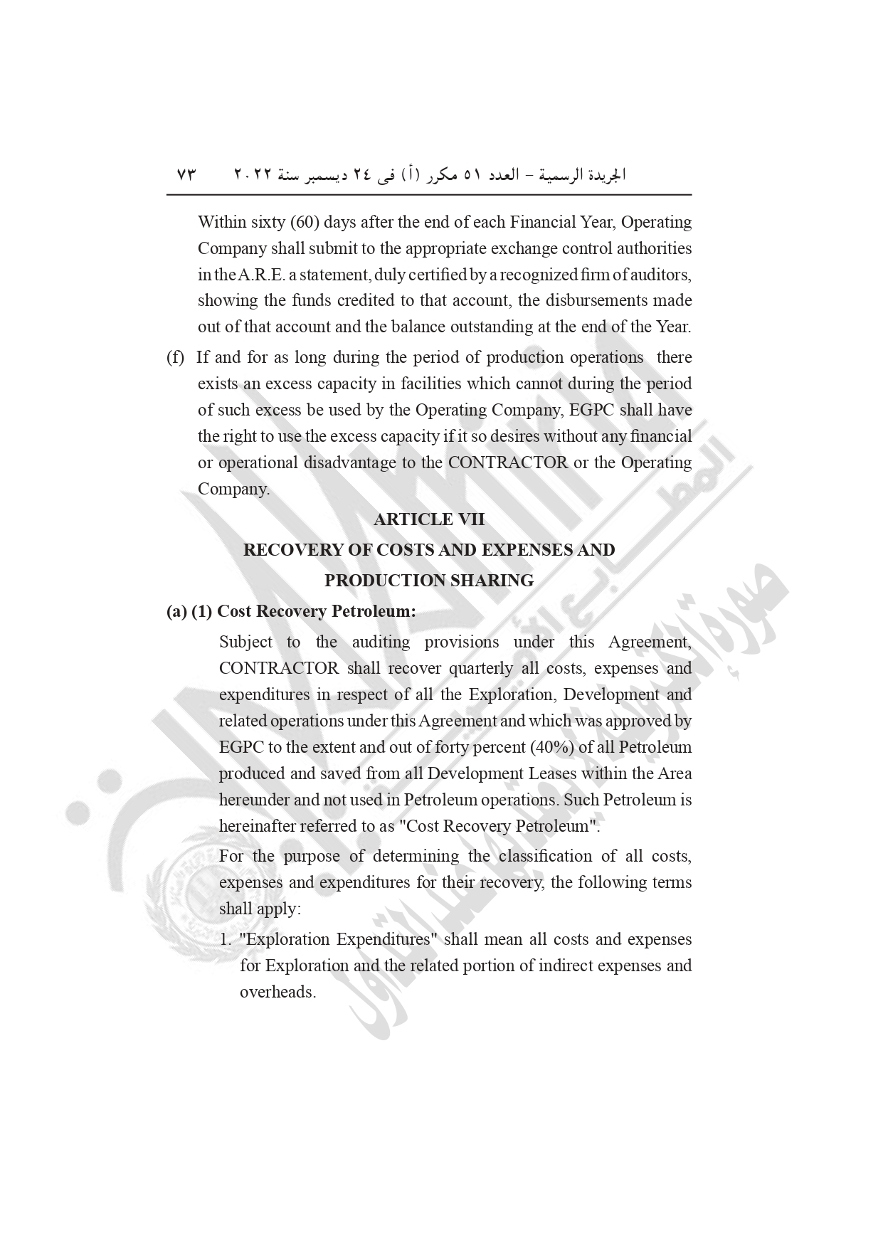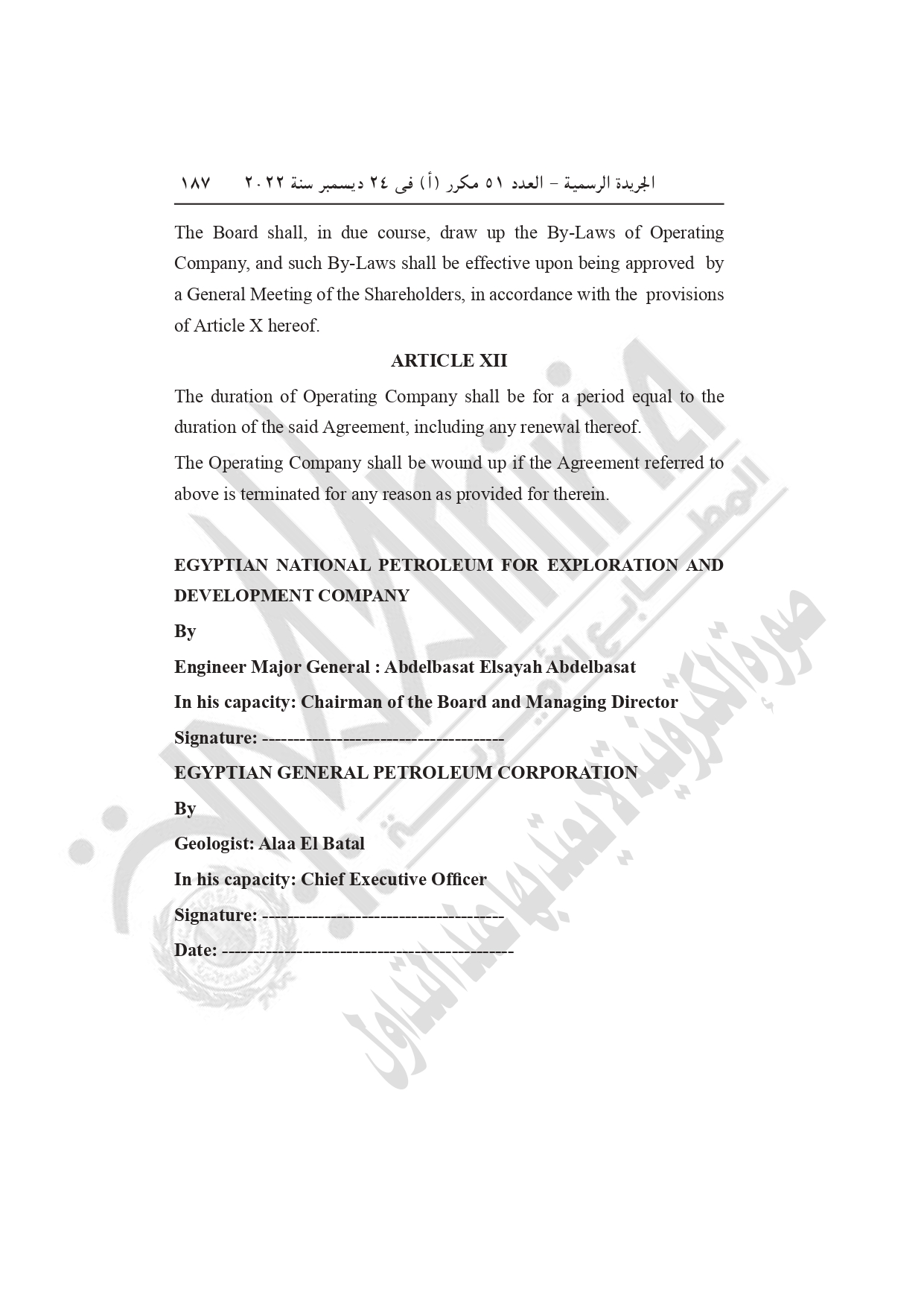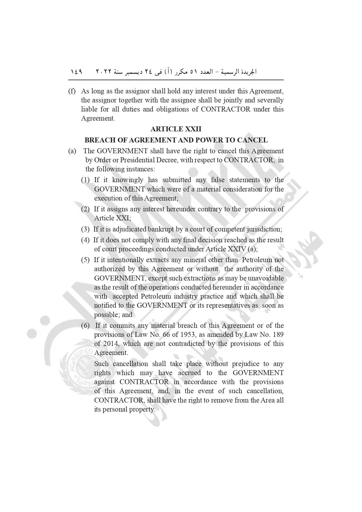 نشرت الجريدة الرسمية في العدد 52 مكرر "أ"، بتاريخ 24 ديسمبر 2022، قرار رئيس جمهورية مصر العربية بالتصديق على القانون رقم 169 لسنة 2022، بشأن أن يرخص لوزير البترول والثروة المعدنية فى التعاقد مع الهيئة المصرية العامة للبترول والشركة الوطنية المصرية لاستكشاف وتنمية البترول للبحث عن البترول واستغلاله فى منطقة جنوب رأس قطارة بالصحراء الغربية "ج.م.ع"، وذلك وفقاً لأحكام الاتفاقية المرافقة والخريطة الملحقة بها.