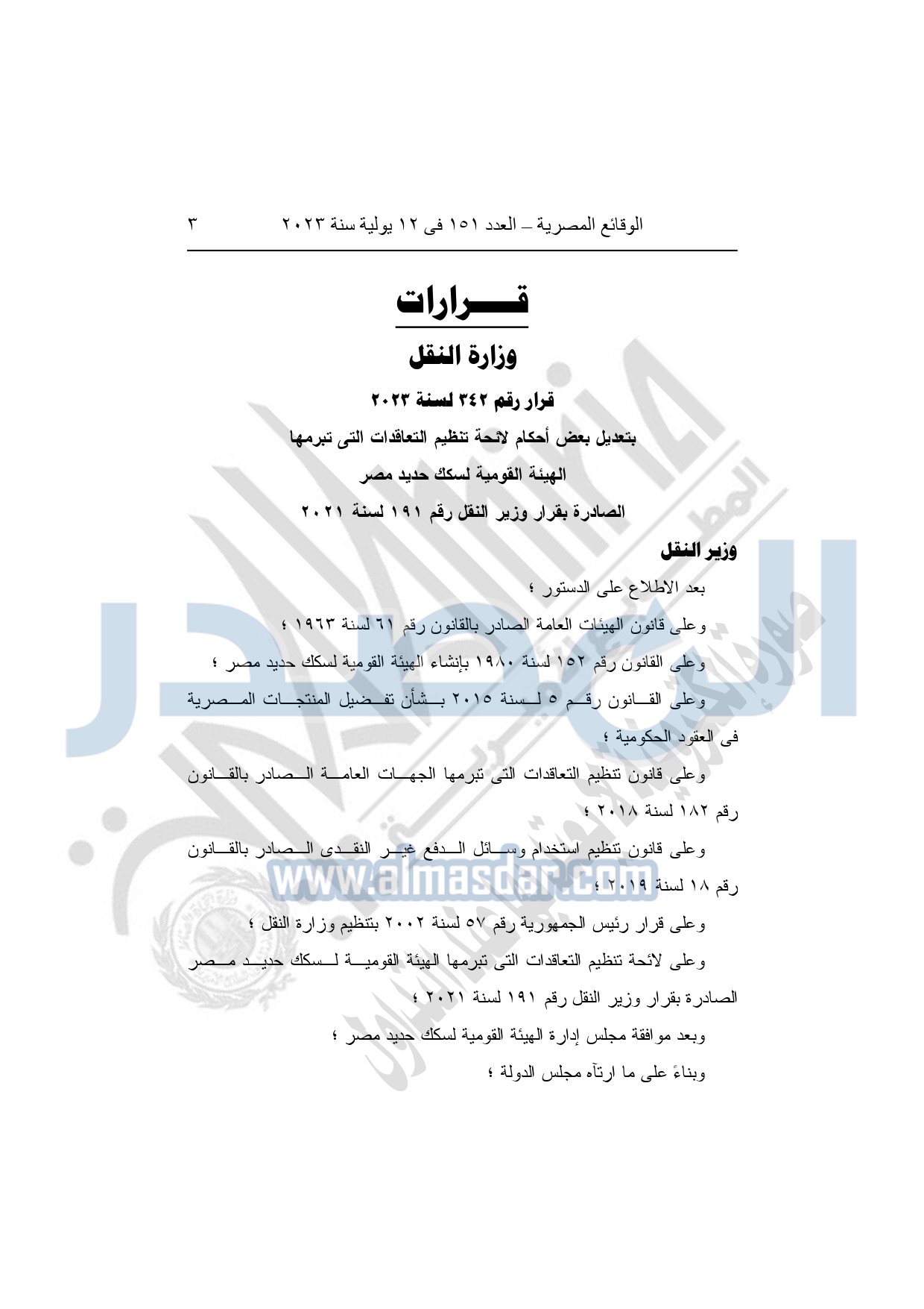 نشرت الوقائع المصرية في العدد 151، بتاريخ 12 يوليو 2023، قرار وزارة النقل رقم 342 لسنة 2023 بشأن تعديل بعض أحكام لائحة تنظيم التعاقدات التي تبرمها الهيئة القومية لسكك حديد مصر الصادرة بقرار وزير النقل رقم 191 لسنة 2021.