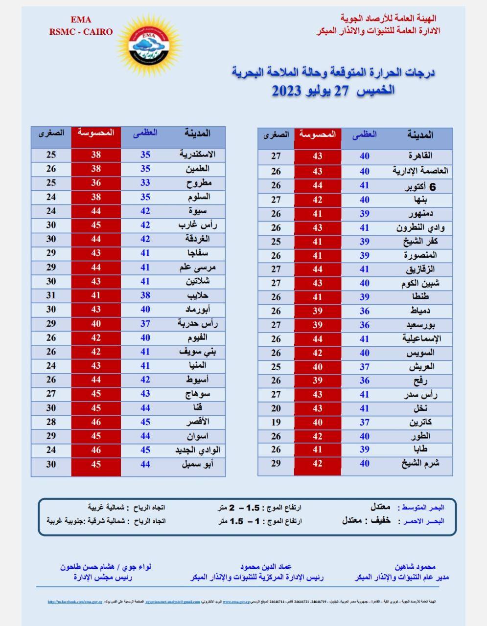 وفيما يلى بيان بدرجات الحرارة المتوقعة غدا على محافظات ومدن مصر