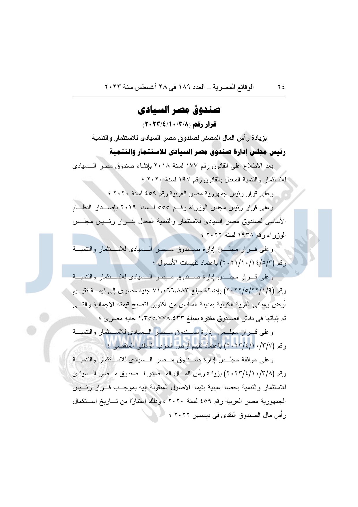 نشرت الوقائع المصرية في العدد 189، بتاريخ 28 أغسطس 2023، قرار صندوق مصر السيادى رقم "8، 3، 10، 4، 2023، بشأن زيادة رأس المال المصدر لصندوق مصر السيادي للاستثمار والتنمية.