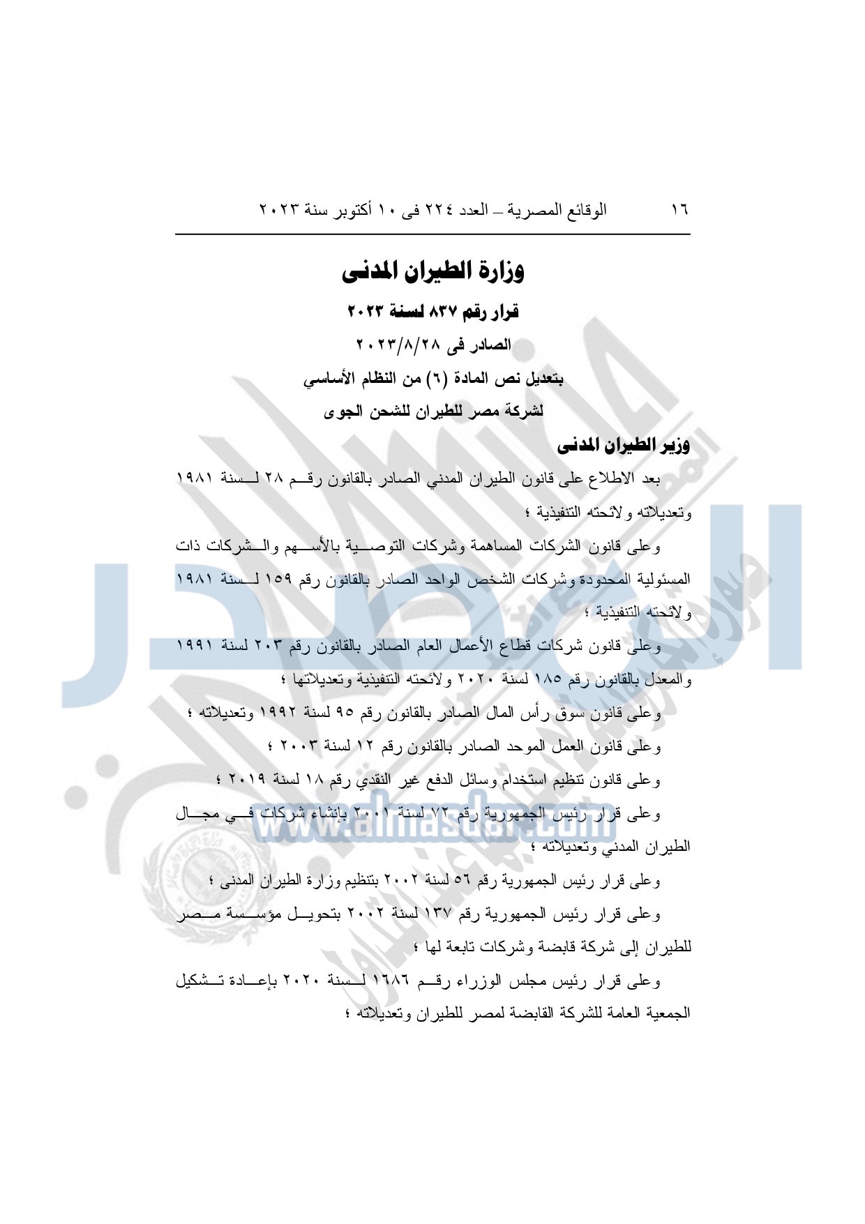 نشرت الجريدة الرسمية في العدد 224، الصادر بتاريخ 10 أكتوبر سنة 2023، قرار وزارة الطيران المدنى رقم 837 لسنة 2023 الصادر بتاريخ 28-8-2023، بشأن تعديل نص المادة "6" من النظام الأساسي لشركة مصر للطيران للشحن الجوى.