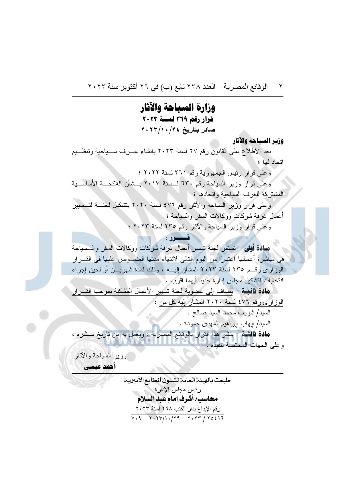 نشرت الوقائع المصرية في العدد 238 تابع "ب"، بتاريخ 26 أكتوبر 2023، قرار وزارة السياحة والآثار رقم 369 لسنة 2023 الصادر بتاريخ 24-10-2023.