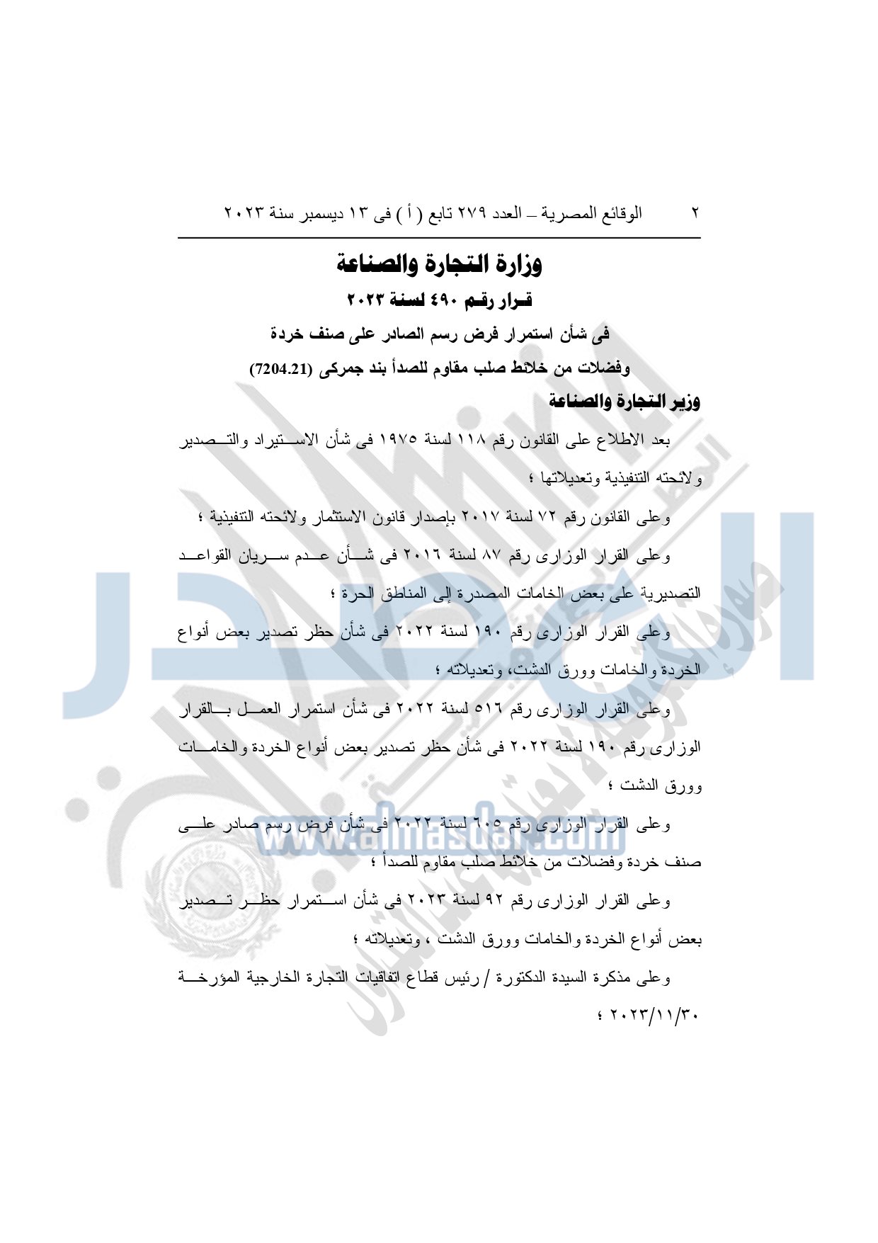 كما جاء القرار بعد الاطلاع على القرار الوزارى رقم 605 لسنة 2022 في شأن فرض رسم صادر عـى صنف خردة وفضلات من خلائط صلب مقاوم للصدأ؛ وعلى القرار الوزارى رقم 92 لسنة 2023 في شأن استمرار حظــر تصدير بعض أنواع الخردة والخامات وورق الدشت، وتعديلاته؛ وعلى مذكرة الدكتورة رئيس قطاع اتفاقيات التجارة الخارجية المؤرخة 30-11-2023.