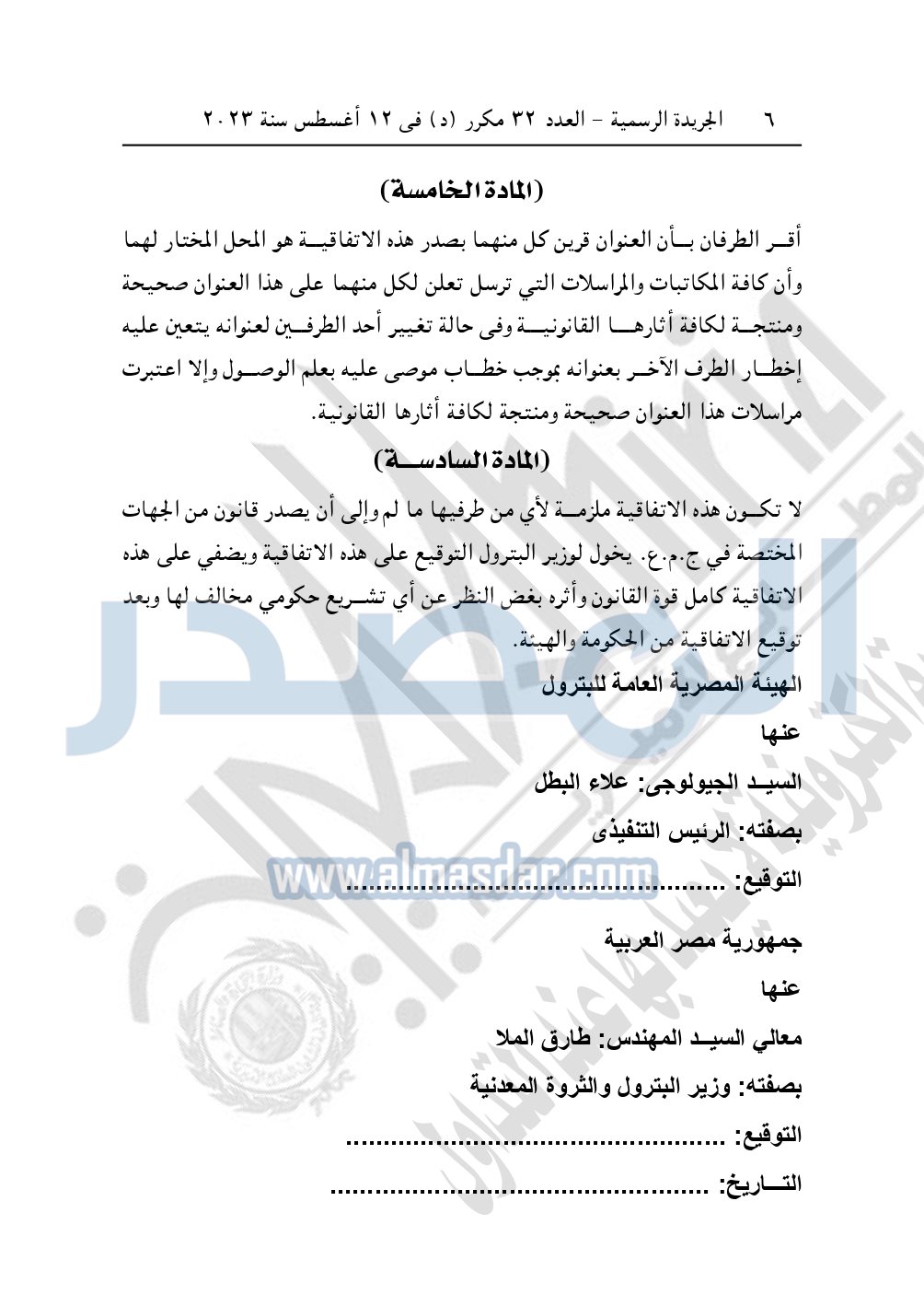 نشرت الجريدة الرسمية في العدد 32 مكرر "د"، بتاريخ 12 أغسطس 2023، قرار رئيس الجمهورية بالتصديق على قانون رقم 168 لسنة 2023، بشأن الترخيص لوزير البترول والثروة المعدنية، في التعاقد مع الهيئة المصرية العامة للبترول للبحث عن البترول وتنميته واستغلاله في منطقة تنمية أشرفى بخليج السويس "ج.م.ع.".