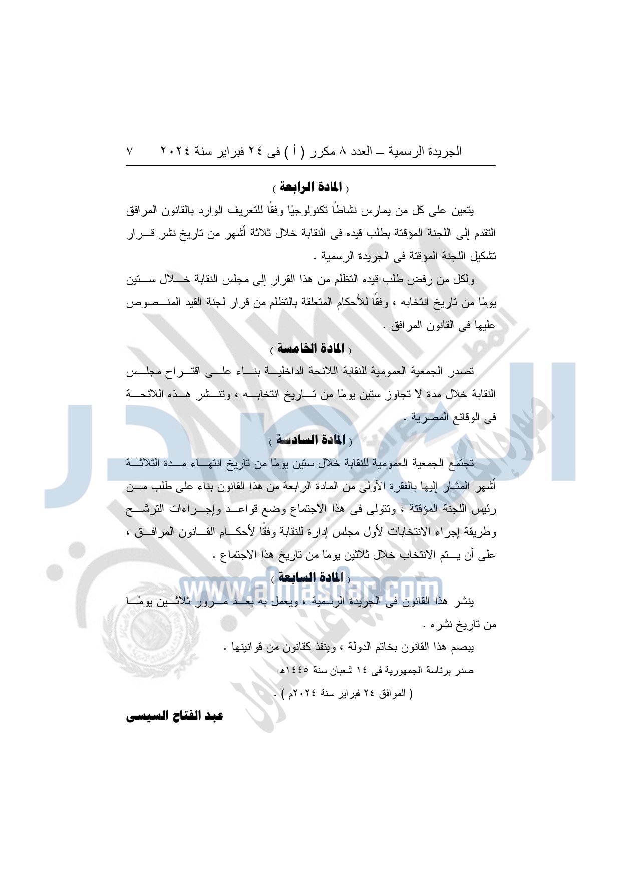 نشرت الجريدة الرسمية في العدد 8 مكرر "أ"، الصادر بتاريخ 24 فبراير 2024، قرار الرئيس عبد الفتاح السيسي رئيس الجمهورية رقم 13 لسنة 2024، بشأن إصدار قانون إنشاء وتنظيم نقابة التكنولوجيين.