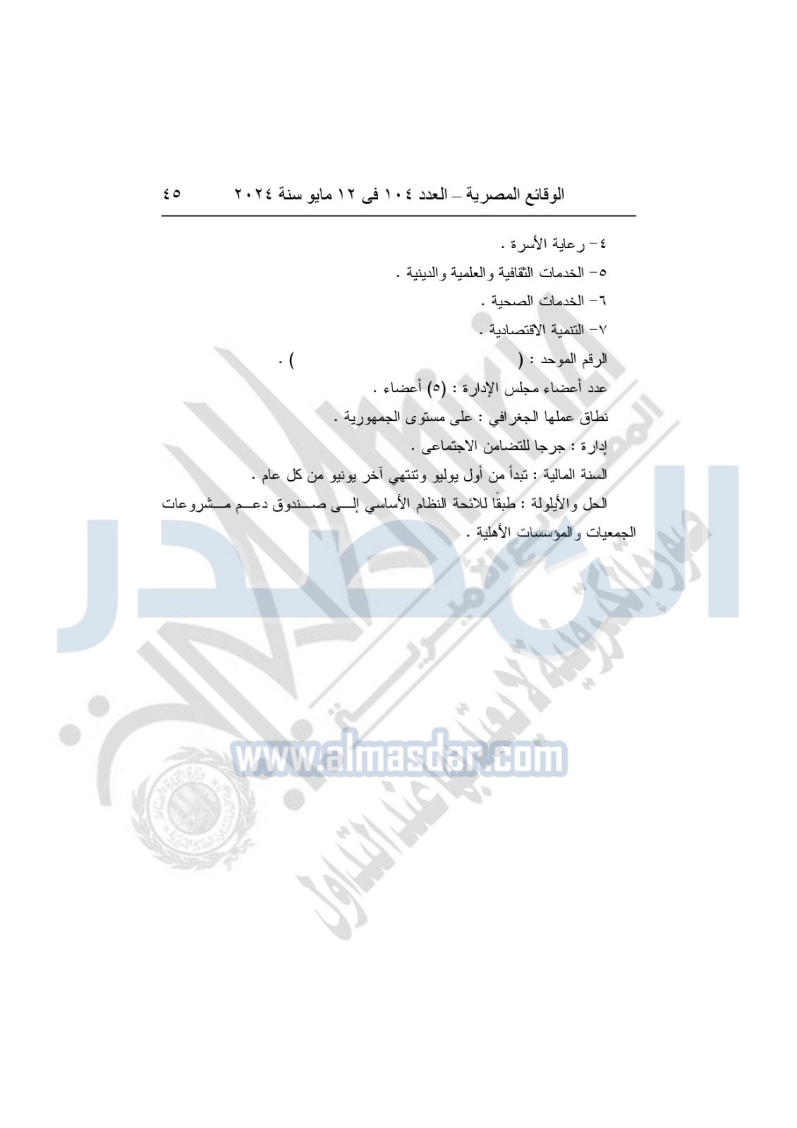 نشرت الوقائع المصرية في العدد 104، بتاريخ 12 مايو 2024، قرار وزارة التضامن الاجتماعي، والخاص بقيد رقم 1180 لسنة 2024 بتاريخ 2-4-2024