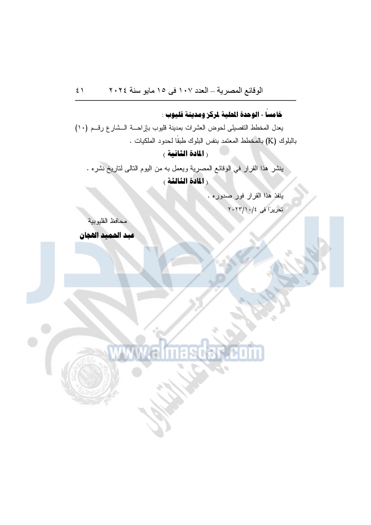 نشرت الوقائع المصرية في العدد 107، بتاريخ 15 مايو 2024، قرار محافظة القليوبية رقم 1386 لسنة 2023، بشأن تعديل المخططات التفصيلية للوحدة المحلية لمركز ومدينة بنها.