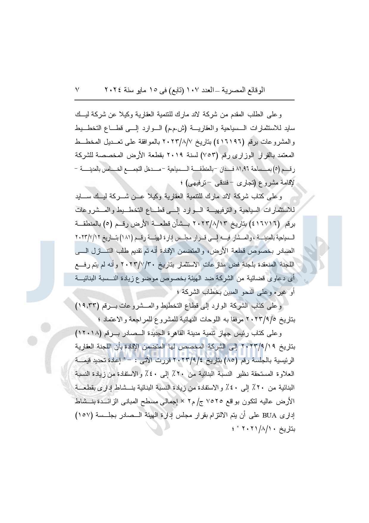 وأوضحت الوقائع المصرية، أن المادة الأولى تنص على اعتماد تعديل تخطيط وتقسيم قطعة الأرض رقم "5" بمساحة 81.97 فدان بالمنطقة السياحية بمدينة القاهرة الجديدة المخصصة لشركة ليك سايد للاستثمارات والعقارية لإقامة مشروع "تجارى - إدارى - فندقى – ترفيهى" المعتمد بالقرار الوزارى رقم 725 لسنة 2019 والمعدل بالقرار الوزارى رقم 753 لسنة 2019، طبقا للاشتراطات والحدود الموضحة على الخريطة المرفقة بهذا القرار والعقد المبرم مع الشركة بتاريخ 19-3-2008، وملاحقه المبرمة بتواريخ 20-6-2013، 9-7-2014 ،30-12-2017، 19-9-2022، والتى تعتبر جميعها مكملة لهذا القرار.