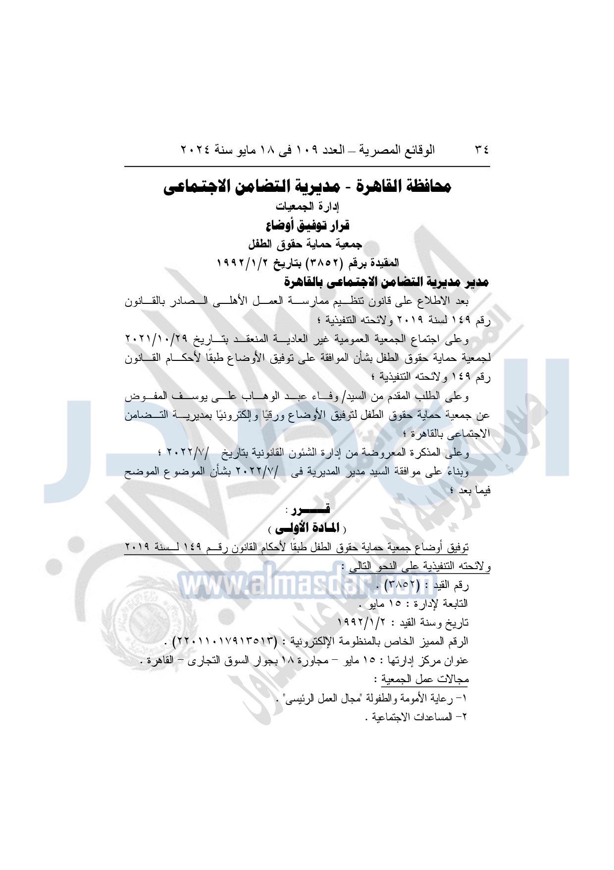 نشرت الوقائع المصرية في العدد 109، بتاريخ 18 مايو 2024، قرار مديرية التضامن الاجتماعي بالقاهرة، بشأن توفيق أوضاع جمعية حماية حقوق الطفل المقيدة برقم "3852" بتاريخ 2-1-1992.