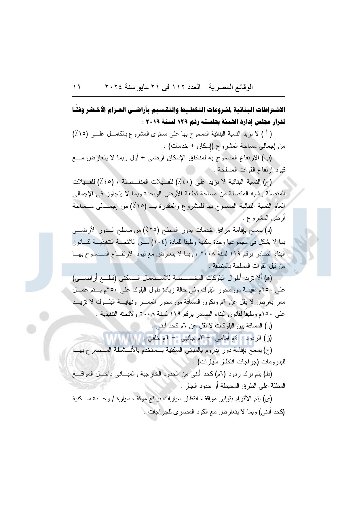 نشرت الوقائع المصرية في العدد 112، بتاريخ 21 مايو 2024، قرار وزارة الإسكان والمرافق والمجتمعات العمرانية رقم 1129 لسنة 2023، بتاريخ 20-12-2023، بشأن اعتماد تخطيط وتقسيم قطعة الأرض رقم "11/ أ /2" بمساحة 2.5 فدان بما يعادل 10500م 2 الواقعة بالحوض رقم "11" بالحزام الأخضر بمدينة 6 أكتوبر المخصصة لـ محمد العربى محمد موسی علی - مى عماد عبد الوهاب على ترکی - نهى عماد عبد الوهاب على تركى - لبنى عماد عبد الوهاب على تركى، لإقامة مشروع سكنى بمقابل عيني وخدمات تجارية بعلاوة سعرية إضافية لخدمة قاطني المشروع فقط.