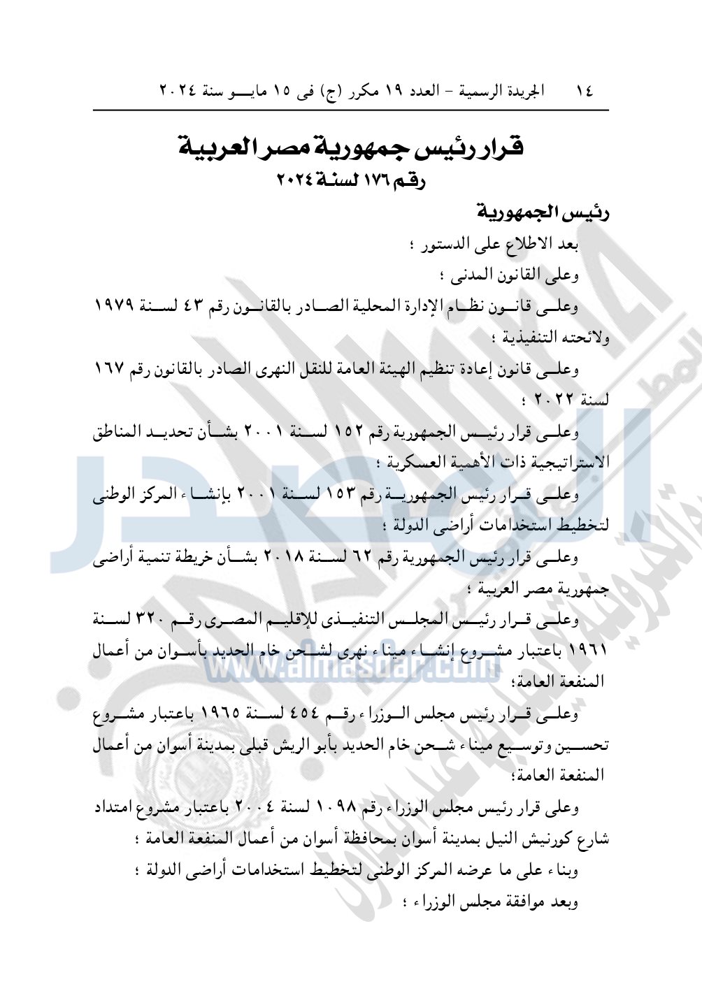 وأوضحت الجريدة الرسمية، أن القرار جاء بعد الاطلاع على الدستور؛ وعلى القانون المدنى؛ وعلى قانون نظام الإدارة المحلية الصادر بالقانون رقم 43 لسنة 1979 ولائحته التنفيذية؛ وعلى قانون إعادة تنظيم الهيئة العامة للنقل النهرى الصادر بالقانون رقم 167 لسنة 2022؛ وعلى قرار رئيس الجمهورية رقم 152 لسنة 2001 بشأن تحديد المناطق الاستراتيجية ذات الأهمية العسكرية.