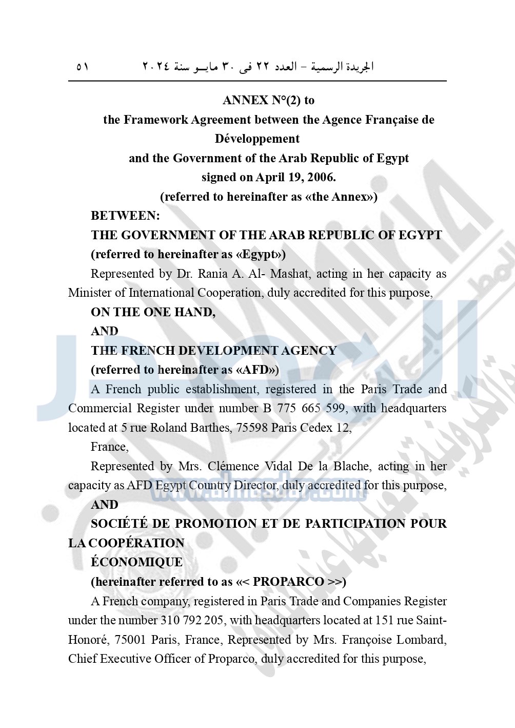 نشرت الجريدة الرسمية في العدد 22 الصادر في 30 مايو سنة 2024، قرار رئيس جمهورية مصر العربية رقم 9 لسنة 2024، بشأن الموافقة على الملحق رقم "2" للاتفاق الإطارى بين حكومة جمهورية مصر العربية والوكالة الفرنسية للتنمية الموقع في 19 أبريل 2006 بشأن إدراج مؤسسة الخبرة الفرنسية ضمن مجموعة وكالة التنمية الفرنسية.