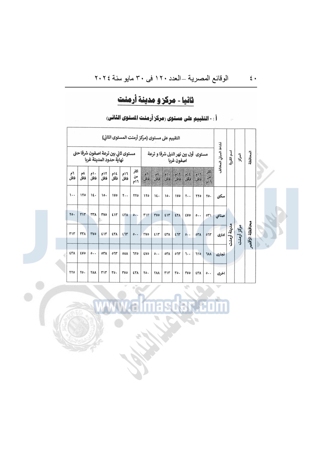 تُحدد قيمة سعر المتر المسطح بالجنيه المصرى لمقابل التصالح فى بعض مخالفات البناء وتقنين أوضاعها وفقا للقانون رقم 187 لسنة 2023 ولائحته التنفيذية بنطاق مراكز ومدن محافظة الأقصر على النحو الموضح بالجداول المرفقة.