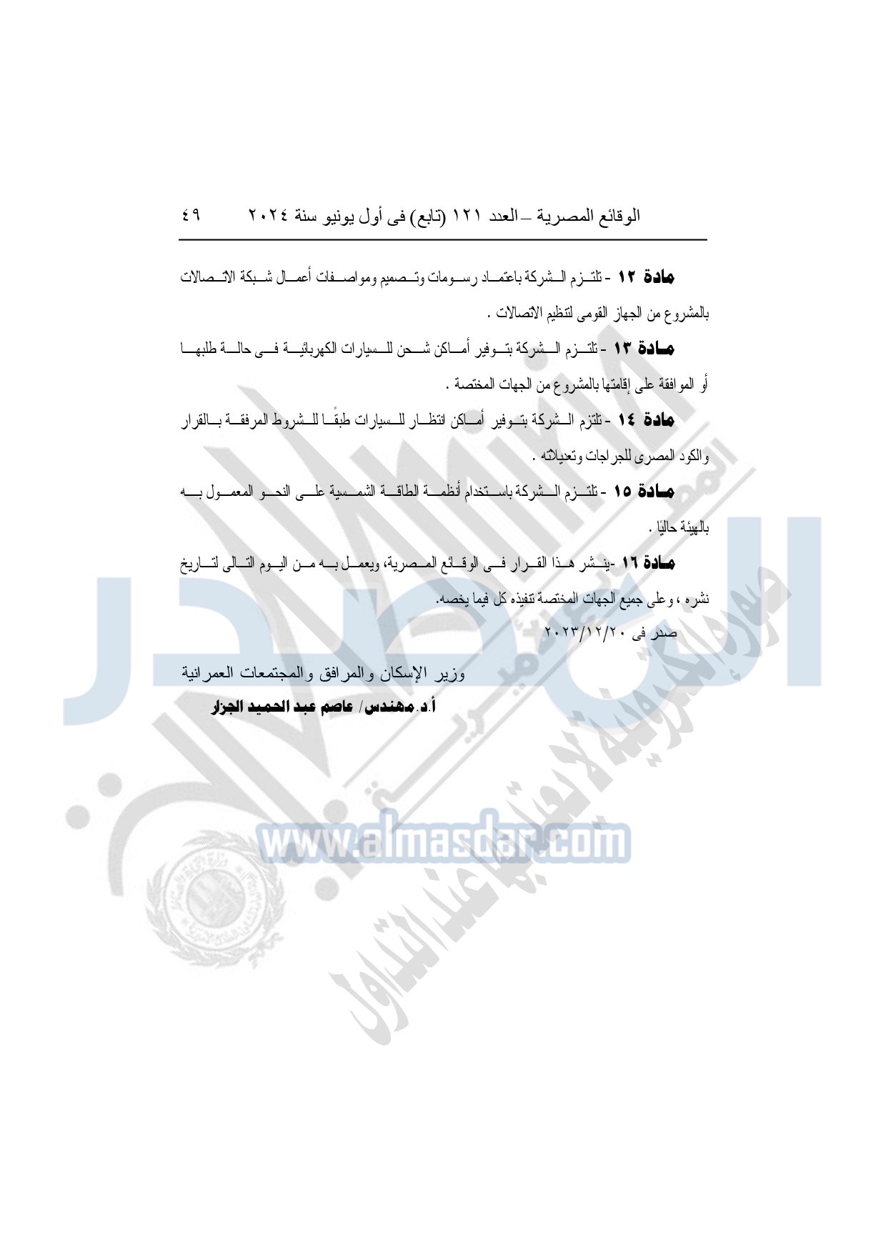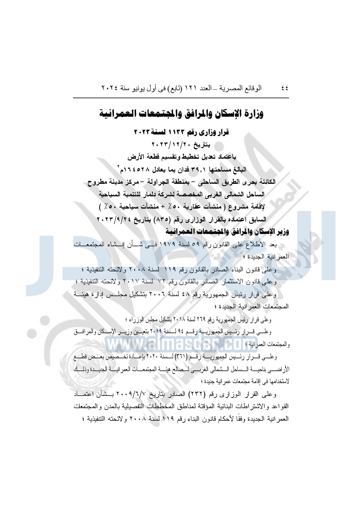 نشرت الوقائع المصرية في العدد 121 "تابع"، بتاريخ أول يونيو سنة 2024، قرار وزارة الإسكان والمرافق والمجتمعات العمرانية رقم 1133 لسنة 2023، بتاريخ 20-12-2023، بشأن اعتماد تعديل تخطيط وتقسيم قطعة الأرض البالغ مساحتها 39.1 فدان بما يعادل 164528م2 الكائنة بحرى الطريق الساحلى – بمنطقة الجراولة – مركز مدينة مطروح الساحل الشمالي الغربي المخصصة لشركة دلمار للتنمية السياحية مشروع "منشآت عقارية 50% + منشآت سياحية 50% السابق اعتماده بالقرار الوزارى رقم "835" بتاريخ 24-9-2023.