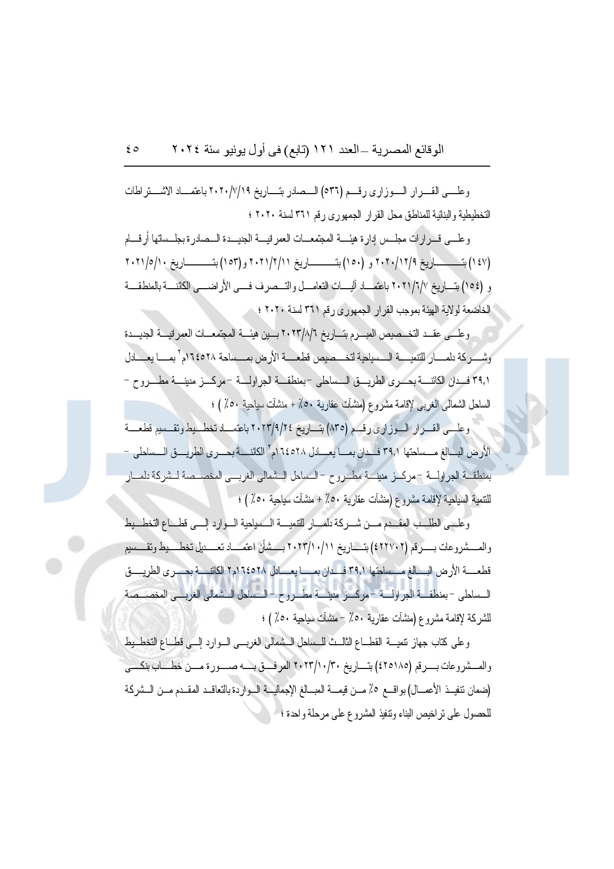 واوضحت الوقائع المصرية، أن المادة الأولي تنص على أن يعتمد تعديل تخطيط وتقسيم قطعة الأرض البالغ مساحتها 39.1 فدان بما يعادل 164528م2 بحرى الطريق الساحلى – بمنطقة الجراولة – مركز مدينة مطروح الساحل الشمالي الغربي المخصصة لشركة دلمار للتنمية السياحية مشروع "منشآت عقارية "50% + منشآت سياحية 50%"، وذلك طبقا للحدود الموضحة على الخريطـة المرفقة بهذا القرار والعقد المبرم مع الشركة بتاريخ 6-8-2023، والتي تعتبر جميعها مكملة لهذا القرار.