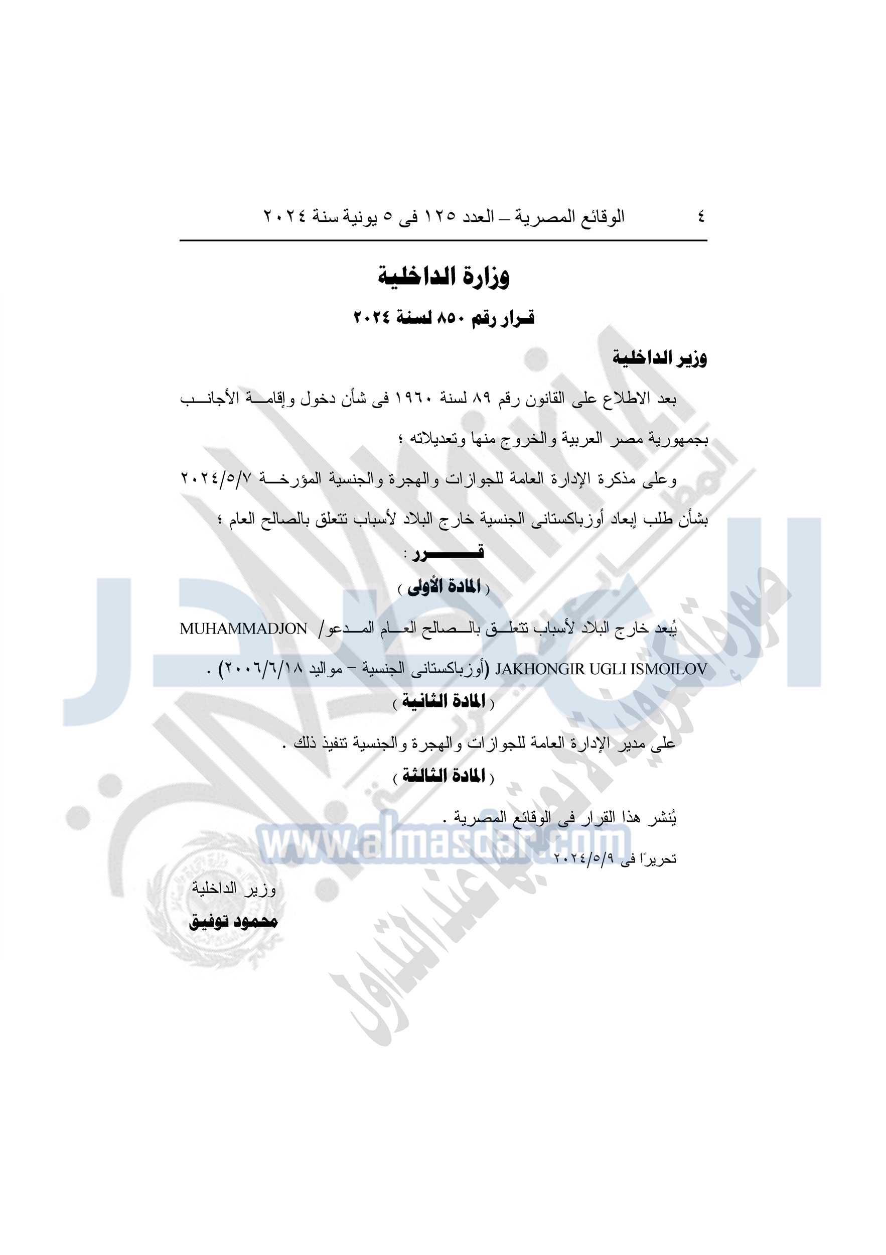 كما نشرت الوقائع المصرية في العدد 125، الصادر في 5 يونيو سنة 2024، قرار وزارة الداخلية رقم 850 لسنة 2024، بشأن طلب إبعاد أوزباكستاني الجنسية خارج البلاد.
