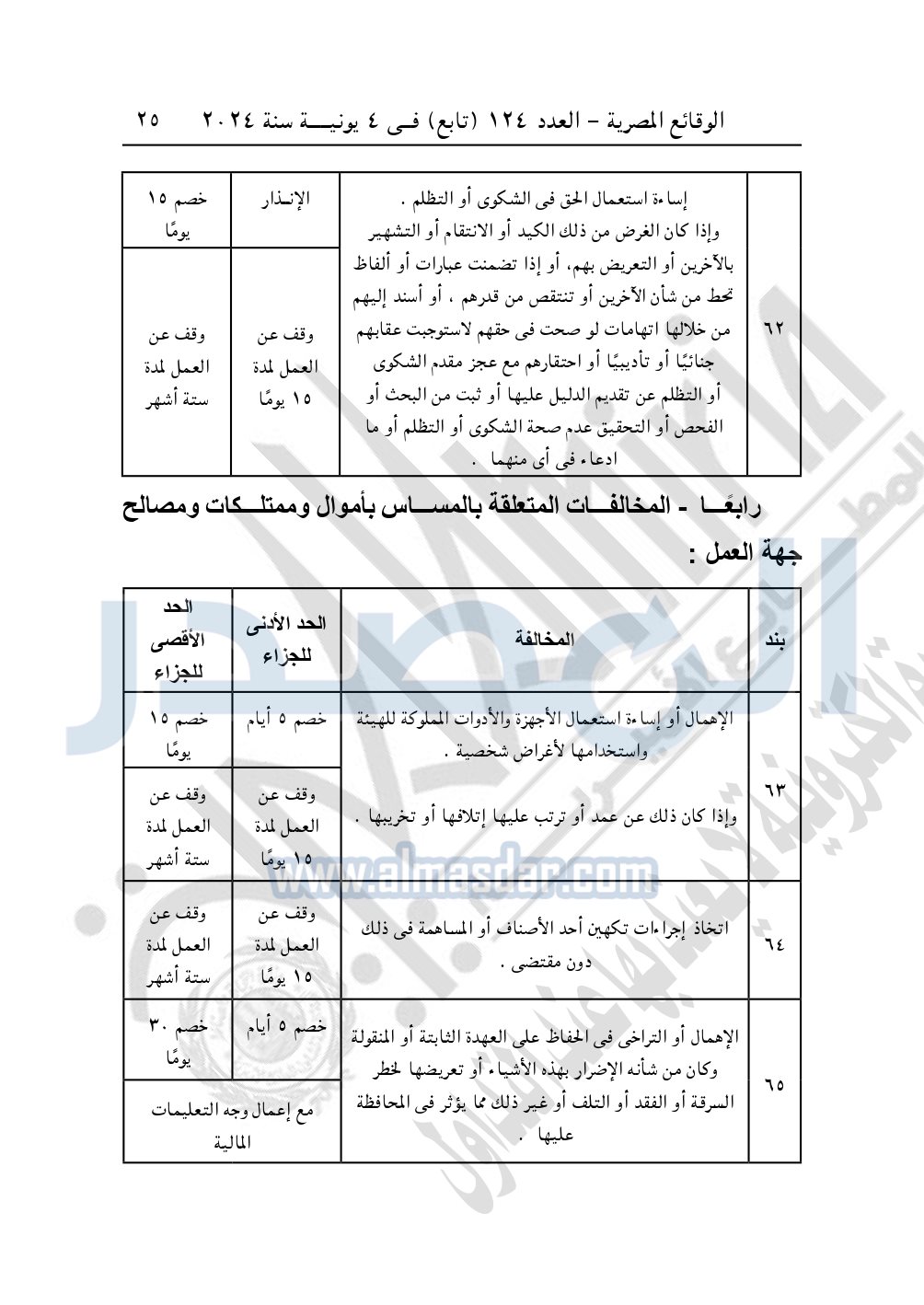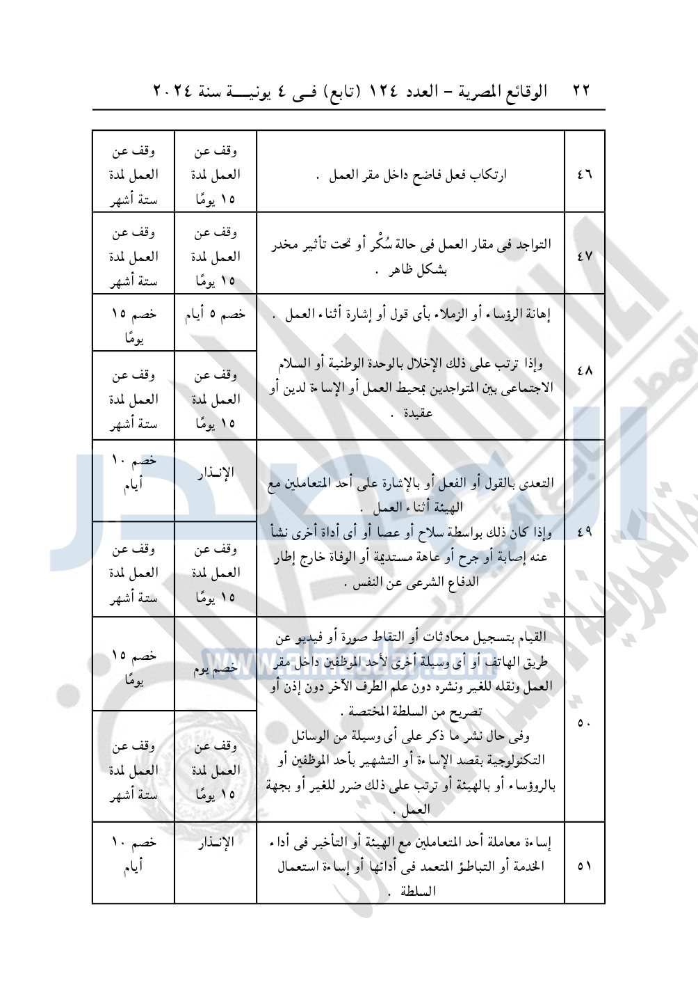 وأشارت الوقائع المصرية، إلى أن القرار جاء بعد الاطلاع أيضاً على قانون إعادة تنظيم الهيئة العامة للنقل النهرى الصادر بالقانون رقم 167 لسنة 2022؛ وعلى اللائحة التنفيذية لقانون الخدمة المدنية المشار إليه الصادرة بالقرار رقم 1216 لسنة 2017؛ وعلى قرار رئيس مجلس إدارة الهيئة رقم 4 لسنة 1982 بشأن المخالفات والجزاءات للعاملين بالهيئة؛ وعلى ما عرضته الإدارة العامة للشئون القانونية؛ وعلى موافقة مجلس إدارة الهيئة بجلسته رقم "146" بتاريخ 13-9-2023؛ وبناء على ما ارتآه مجلس الدولة.