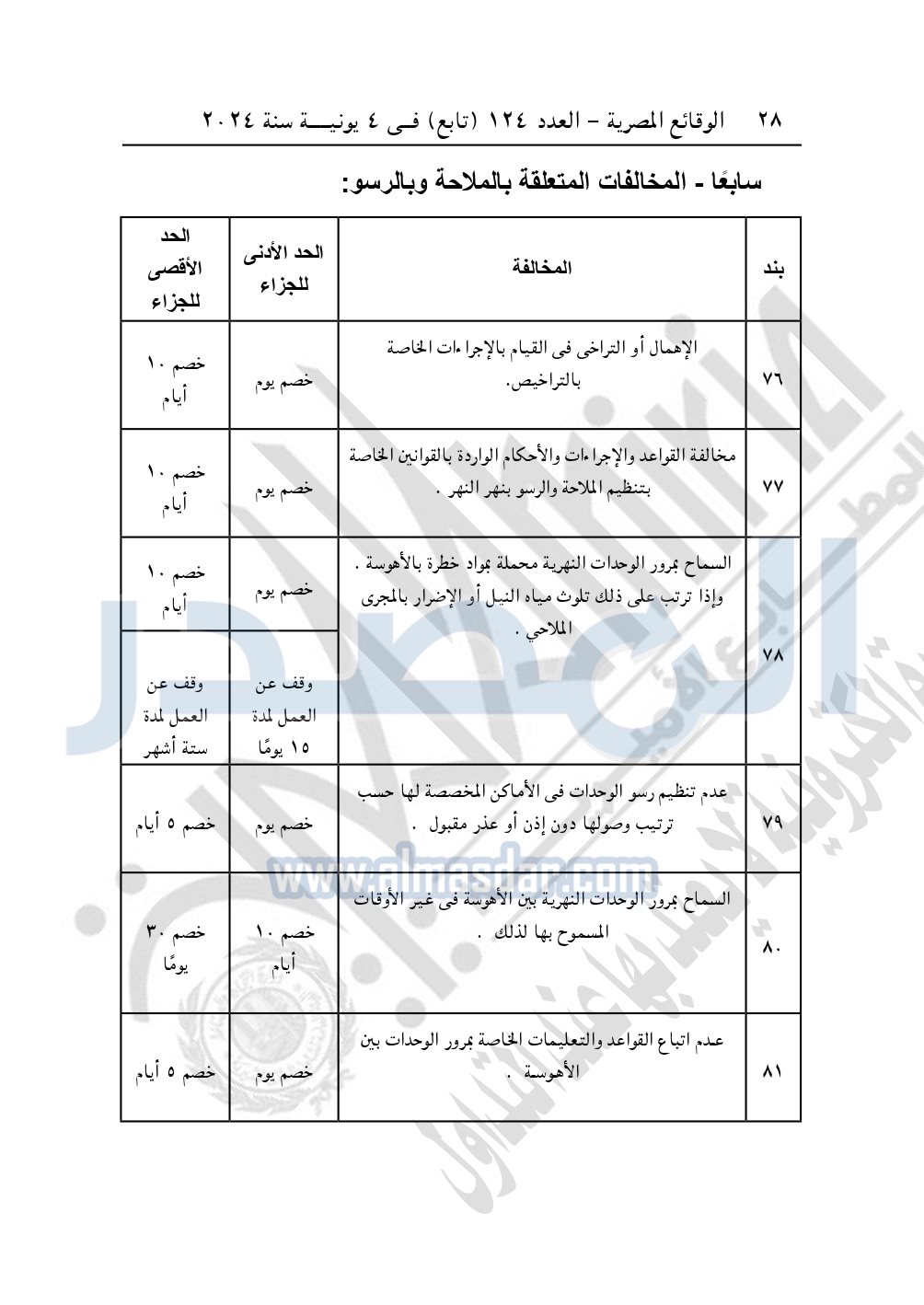 نشرت الوقائع المصرية في العدد 124 "تابع"، الصادر في 4 يونيو سنة 2024، قرار وزارة النقل رقم 1 لسنة 2024، بشأن إصدار لائحة المخالفات والجزاءات للموظفين بالهيئة العامة للنقل النهري.