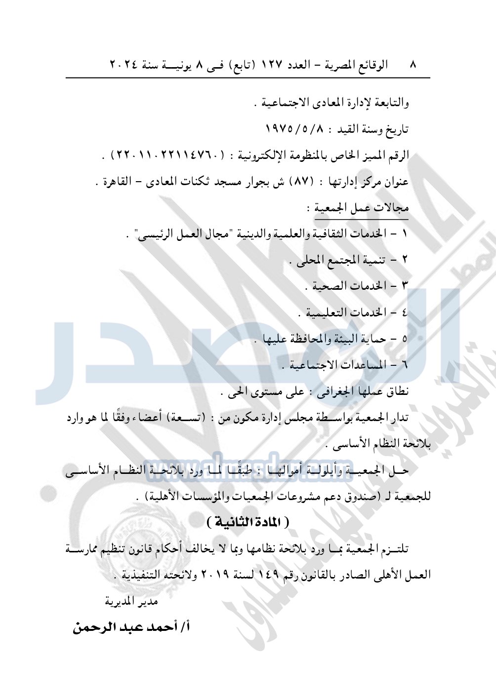 نشرت الوقائع المصرية في العدد 127 "تابع"، بتاريخ 8 يونيو 2024، قرار مديرية التضامن الاجتماعي بالقاهرة، بشأن توفيق أوضاع الجمعية الإسلامية لتنمية المجتمع بثكنات المعادي المقيدة برقم "2052" بتاريخ 8-5-1975.