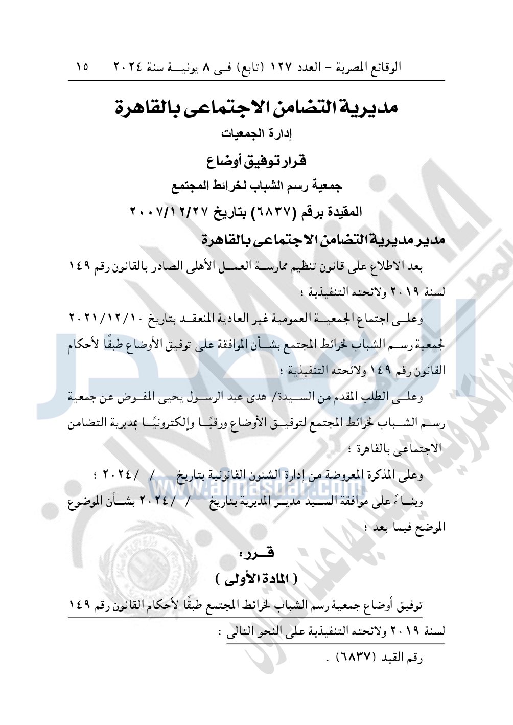كما نشرت الوقائع المصرية في العدد 127 "تابع"، بتاريخ 8 يونيو 2024، قرار مديرية التضامن الاجتماعي بالقاهرة، بشأن توفيق أوضاع جمعية رسم الشباب لخرائط المجتمع المقيدة برقم "6837" بتاريخ 27-12-2007.