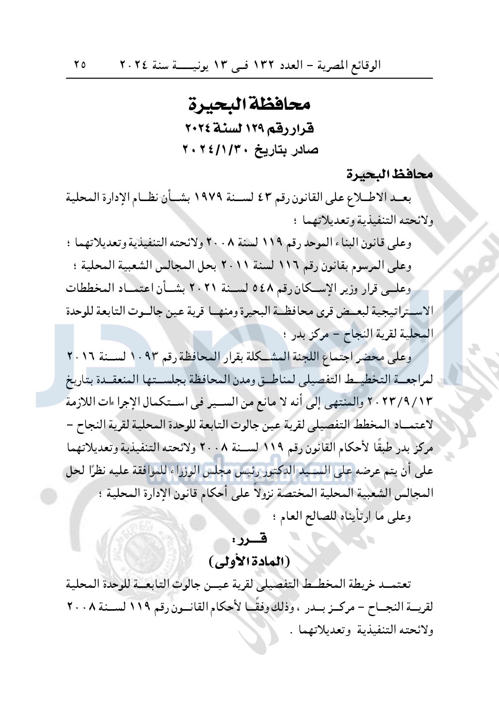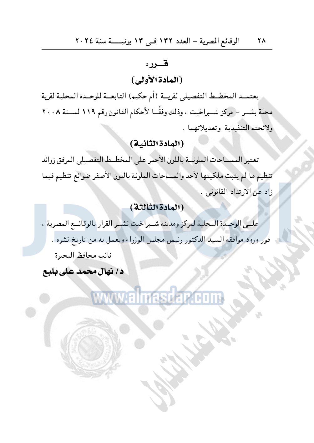 كما نشرت الوقائع المصرية في العدد 132، بتاريخ 13 يونيو 2024، قرار محافظة البحيرة رقم 3286 لسنة 2023، الصادر بتاريخ 19-12-2023، بشأن اعتماد خرائط المخطط التفصيلي لقرية "نبيل الوقاد".