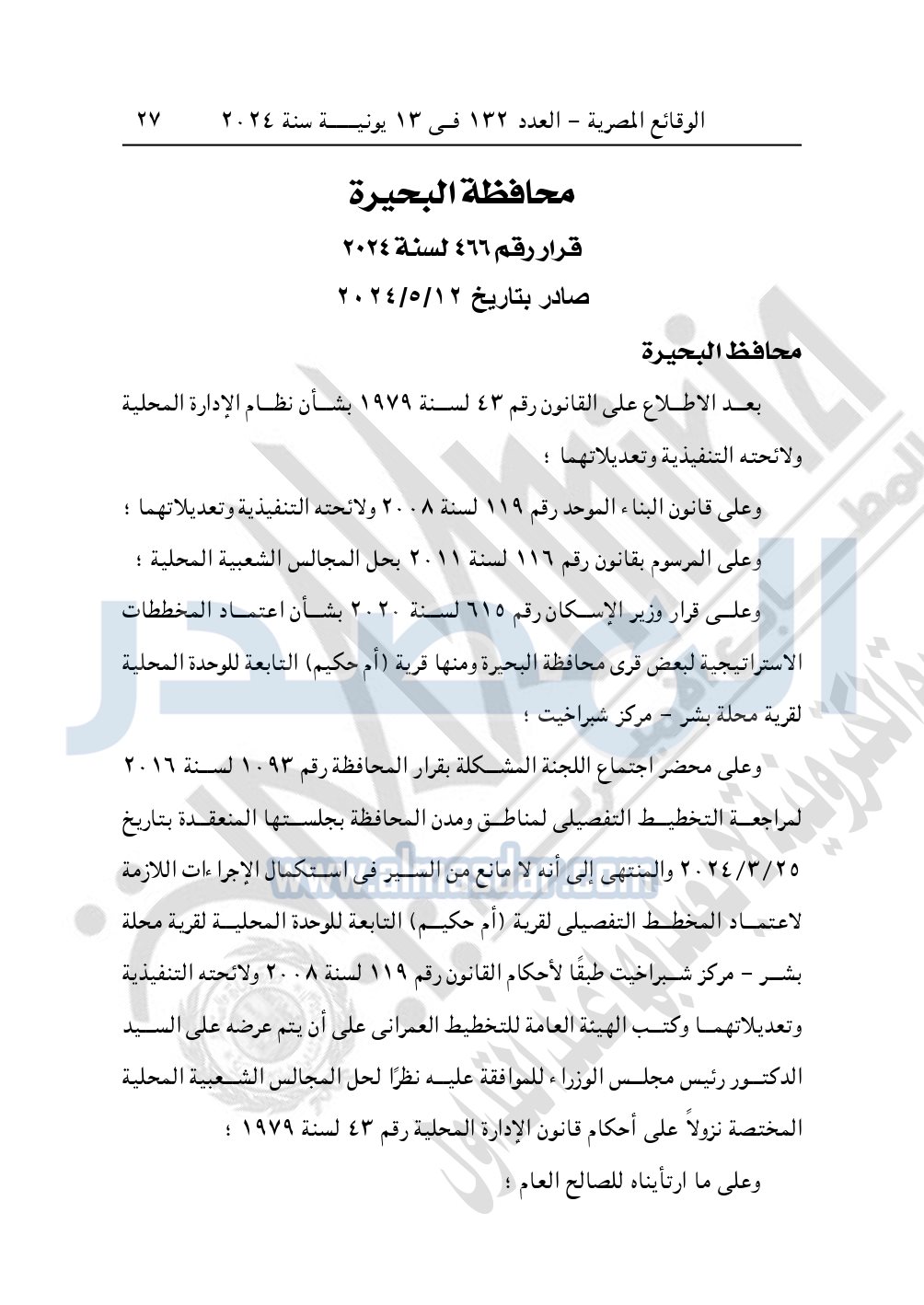 كما نشرت الوقائع المصرية في العدد 132، بتاريخ 13 يونيو 2024، قرار محافظة البحيرة رقم 466 لسنة 2024، الصادر بتاريخ 12-5-2024، بشأن اعتماد المخطط التفصيلي لقرية "أم حكيم".