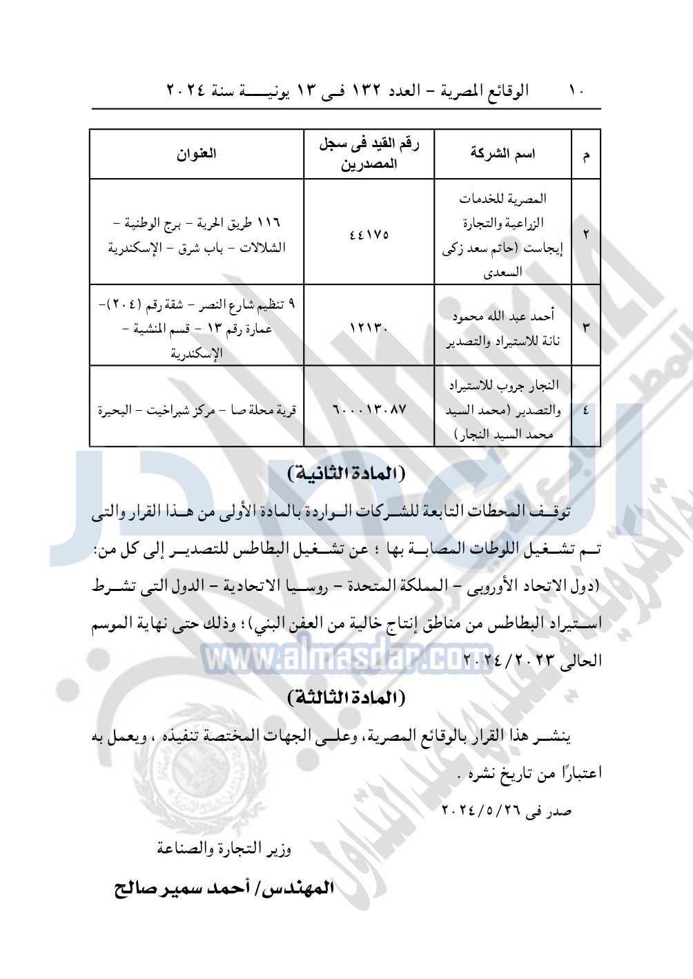 نشرت الوقائع المصرية في العدد 132، بتاريخ 13 يونيو 2024، قرار وزارة التجارة والصناعة رقم 251 لسنة 2024، بشأن وقف بعض الشركات عن تصدير البطاطس إليدى بعض الدول.