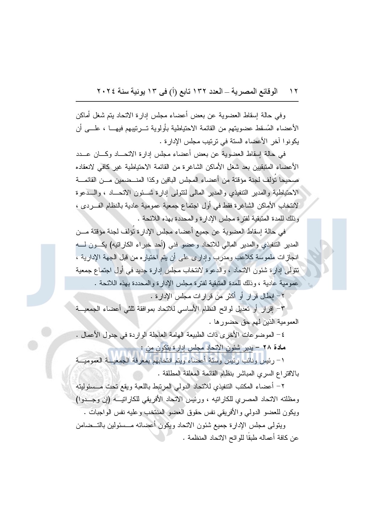 الموافقة على تعديل المواد "2، 3، 4،5، 11،12 ، 15، 16، 18، 23، 28، 29، 30، 34، 35، 36، 39، 40، 41، 46، 47، 48، 51، 73" من لائحة النظام الأساسي للاتحاد المصرى للكاراتيه بناءً علــى قـرار الجمعية العمومية غير العادية للاتحـاد المصري للكاراتيه المنعقدة بتاريخ بتاريخ 29-9-2023، لتصبح كالتالي: