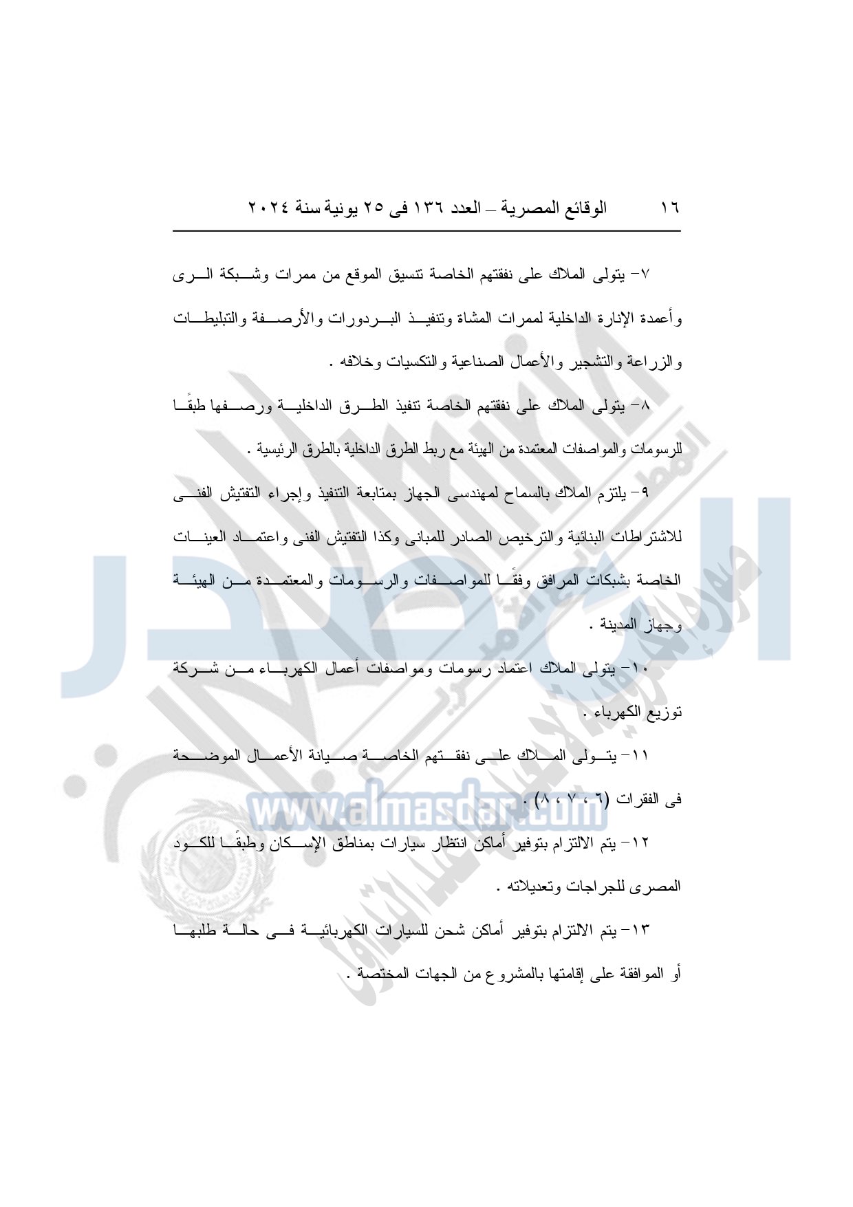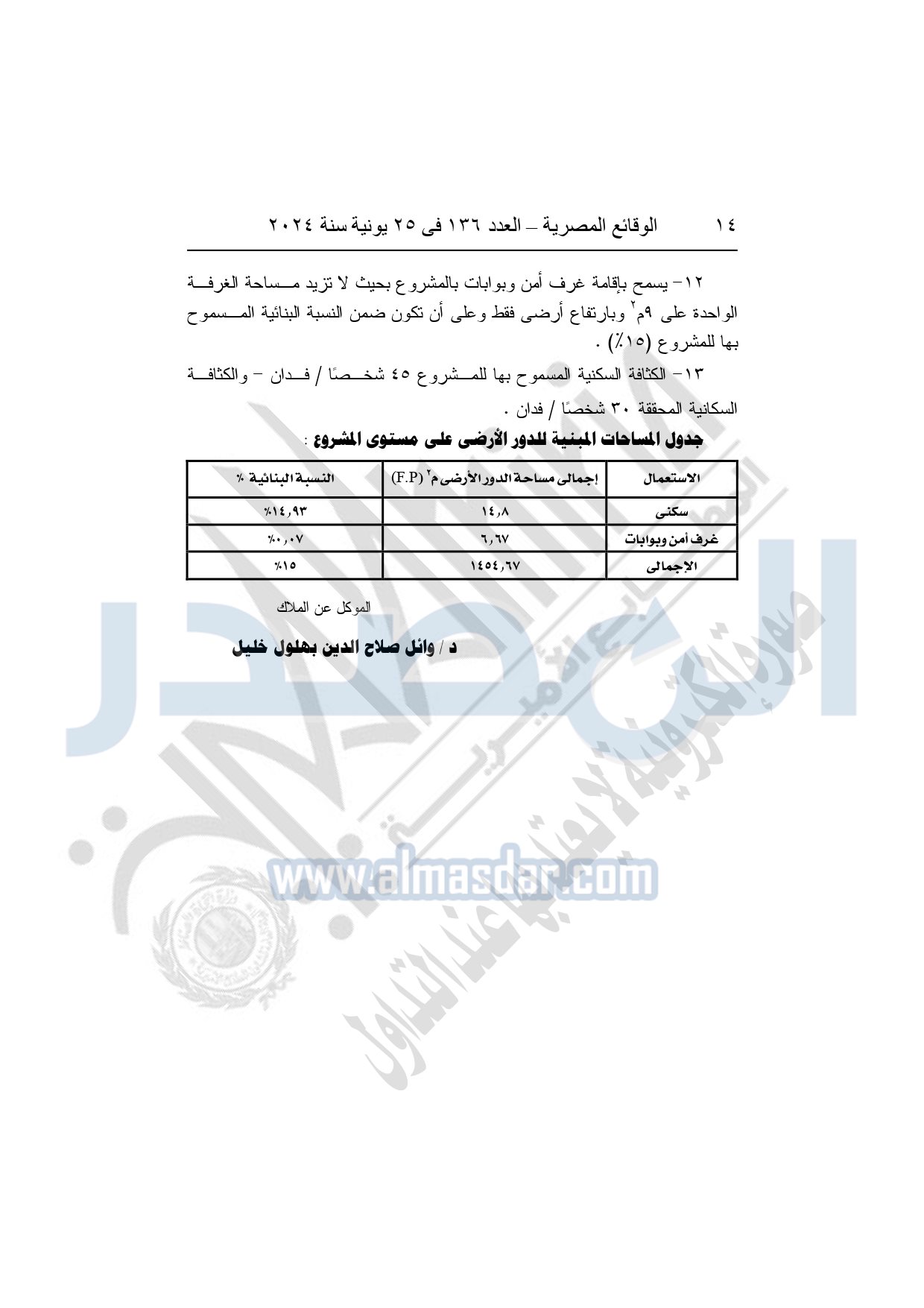 كما نشرت الوقائع المصرية في العدد 136، بتاريخ 25 يونيو سنة 2024، قرار وزارة الإسكان والمرافق والمجتمعات العمرانية رقم 1163 لسنة 2023، بتاريخ 27-12-2023، بشأن اعتماد تخطيط وتقسيم قطعة الأرض رقم "14/أ" بمساحة 2.5 فدان بما يعادل 10500م2 الواقعة بالحوض رقم "25" بالحزام الأخضر بمدينة 6 أكتوبر المخصصة لمرفت محمود صادق عبد العظيم لإقامة مشروع سكنى بمقابل عيني.