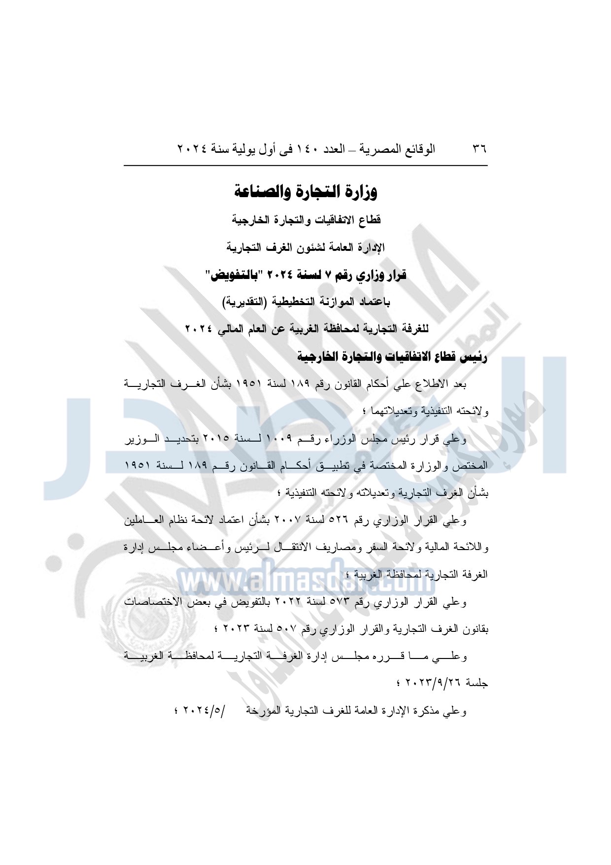 نشرت الوقائع المصرية في العدد 140، بتاريخ أول يوليو سنة 2024، قرار وزارة التجارة والصناعة رقم 7 لسنة 2024، بشأن اعتماد الموازنة التخطيطية "التقديرية" للغرفة التجارية لمحافظة الغربية عن العام المالي 2024.