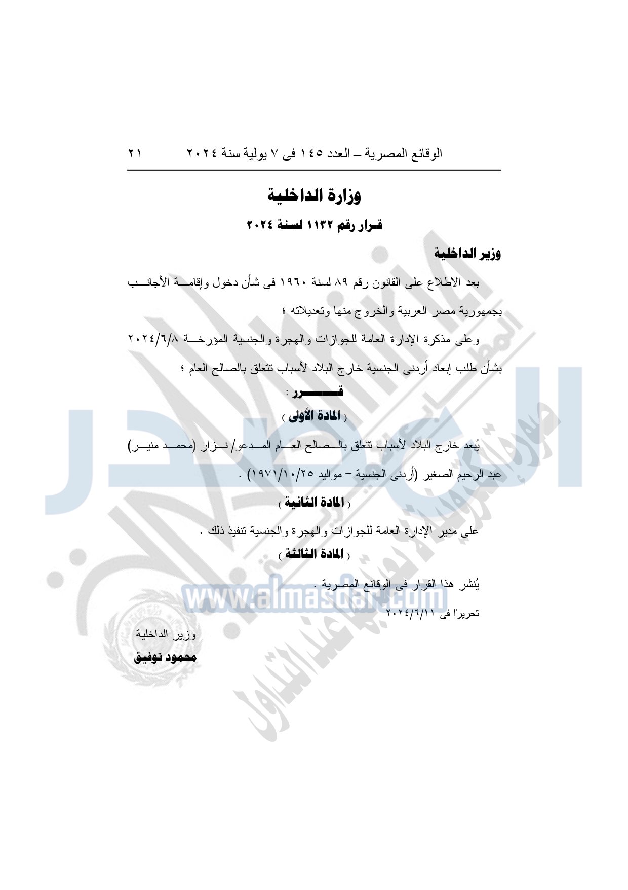 كما نشرت الوقائع المصرية في العدد 145، الصادر في 7 يوليو سنة 2024، قرار وزارة الداخلية رقم 1132 لسنة 2024، بشأن طلب إبعاد أردني الجنسية خارج البلاد.
