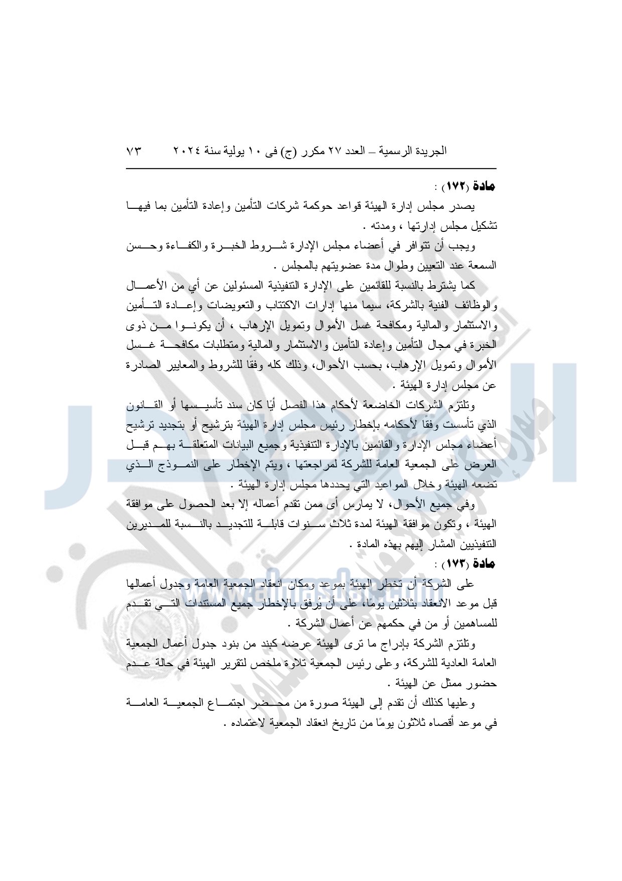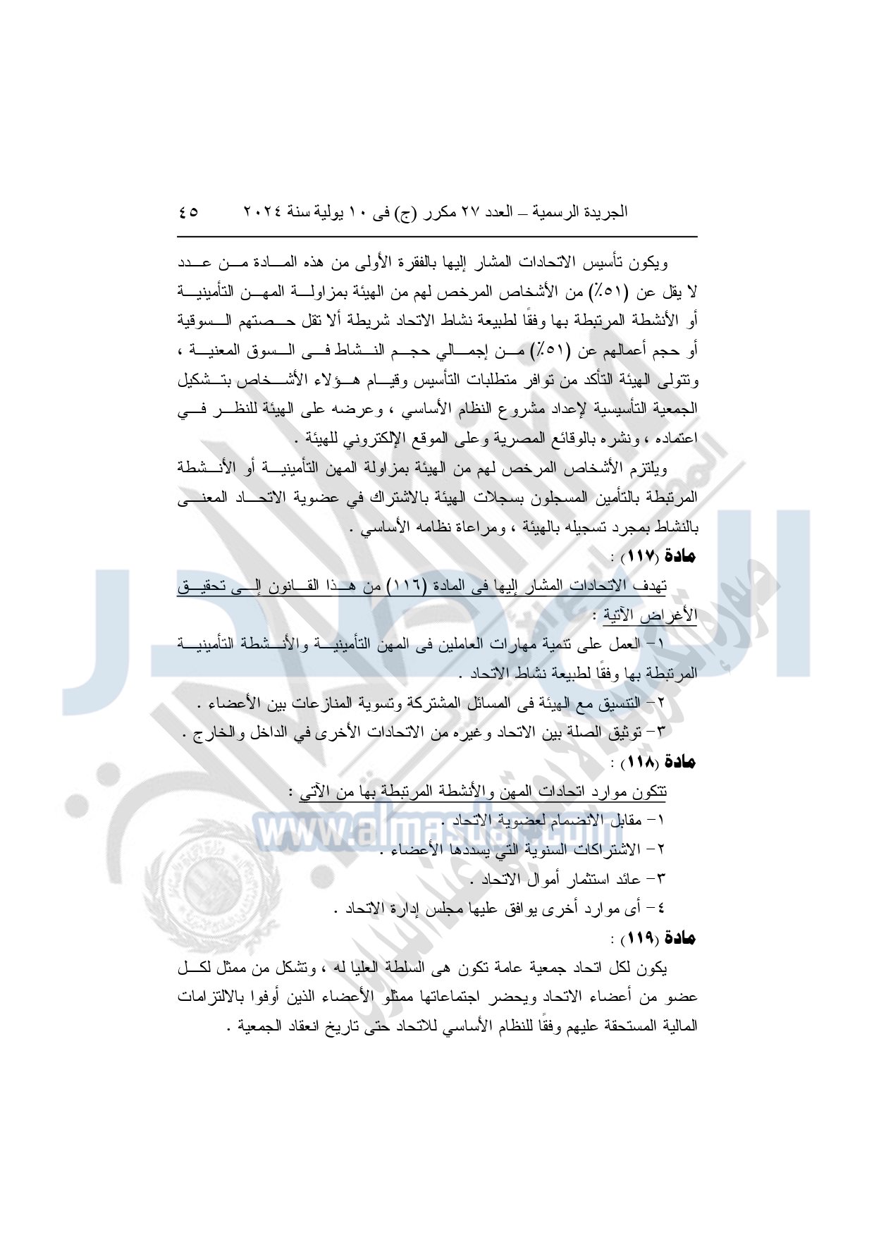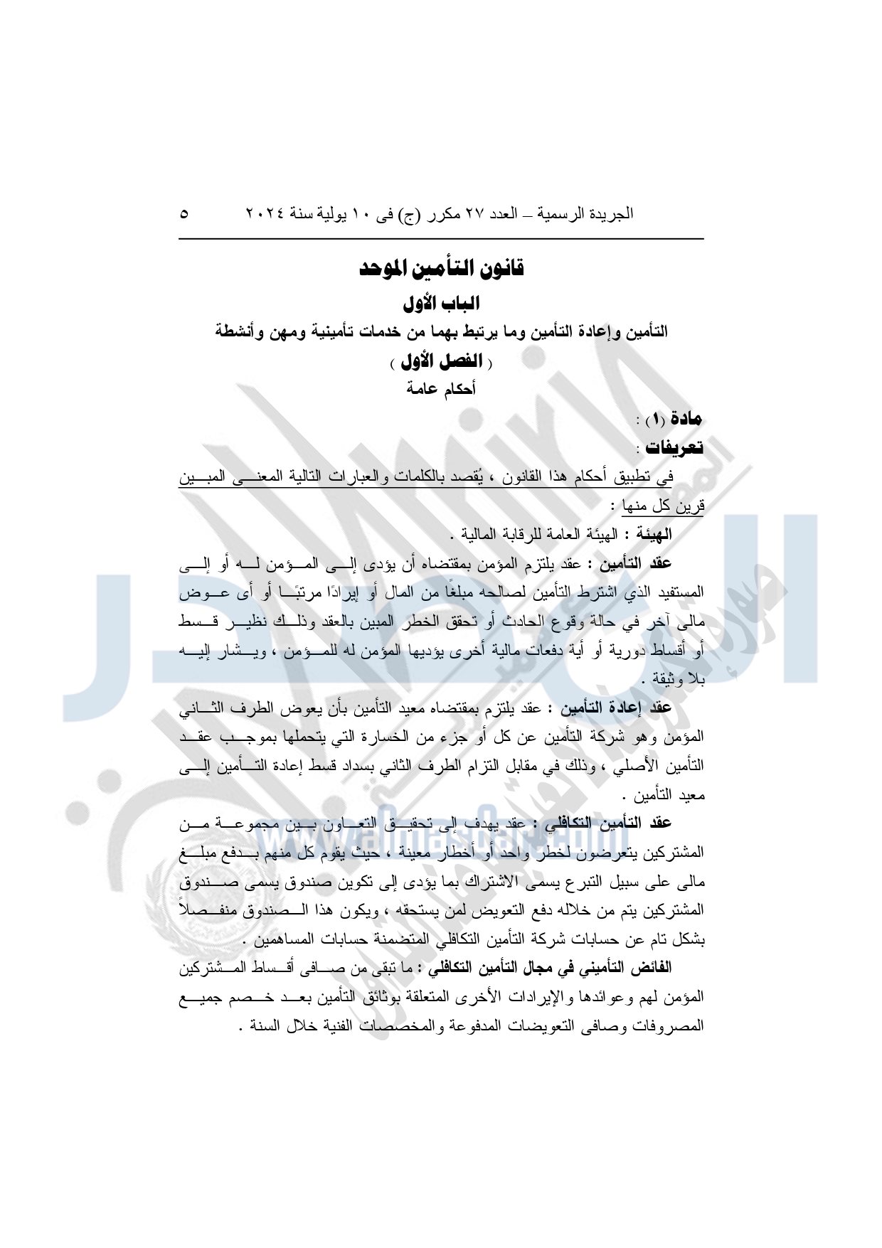 نشرت الجريدة الرسمية في العدد 27 مكرر "ج"، الصادر في 10 يوليو سنة 2024، قرار رئيس جمهورية مصر العربية بالتصديق على القانون رقم 155 لسنة 2024، بشأن إصدار قانون التأمين الموحد.