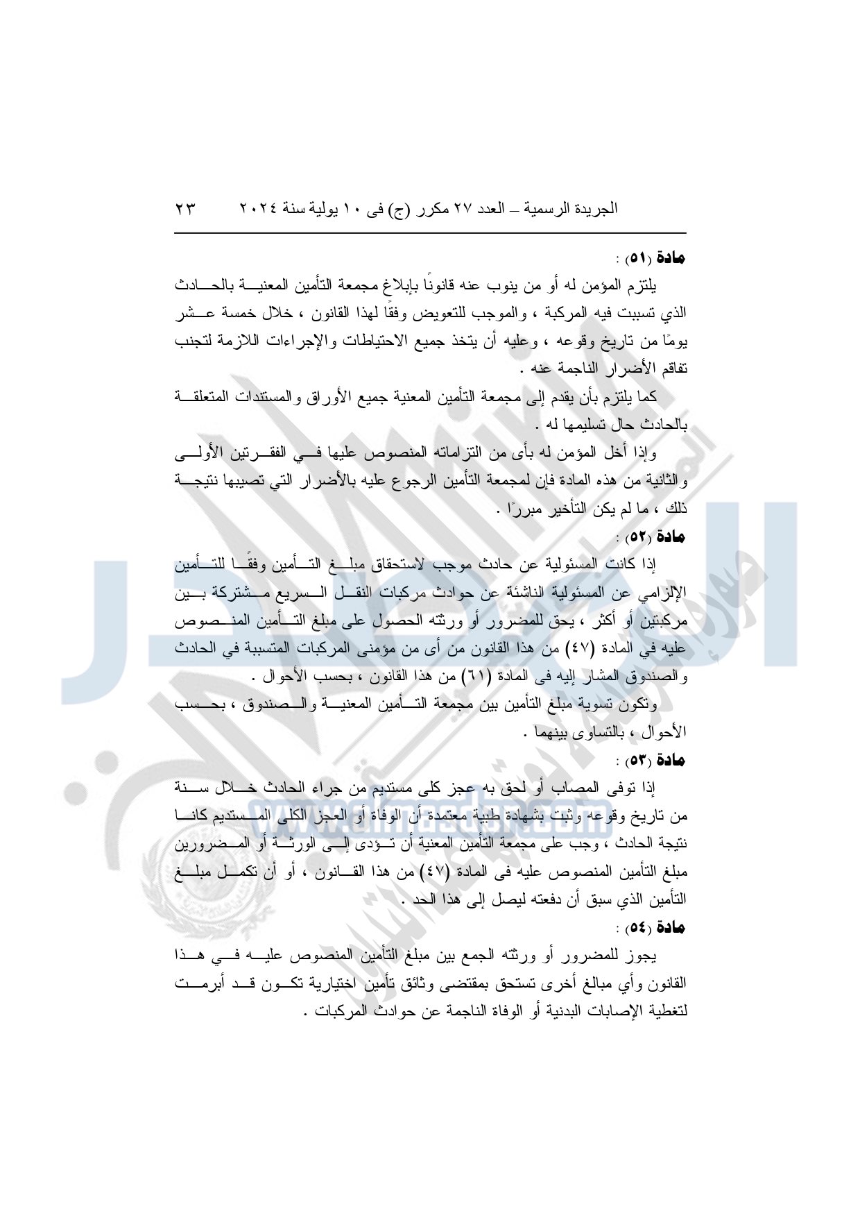 كما يحل الصندوق الحكومى لتغطية الأضرار الناتجة عن حوادث مركبات النقل السريع، المنظم وفق أحكام القانون المرافق، محل الصندوق الحكومي لتغطية الأضرار الناتجة عن حوادث مركبات النقل السريع، المنشأ بالمادة "20" من قانون التأمين الإجباري عن المسئولية المدنية الناشئة عن حوادث مركبات النقل السريع داخل جمهورية مصر العربية المشار إليه، وتئول إليه جميع حقوقه ويتحمل جميع التزاماته.