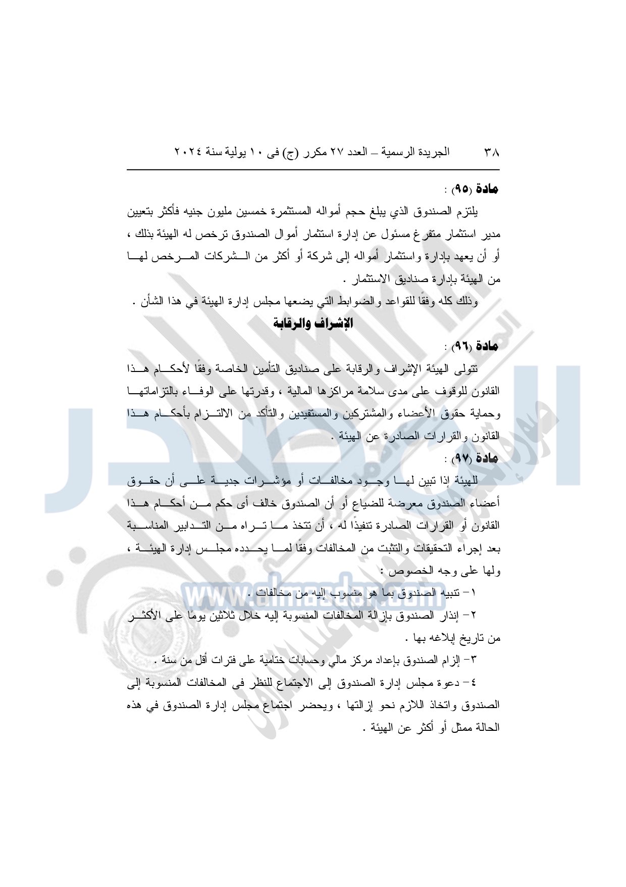 ويكون للهيئة العامة للرقابة المالية، دون غيرها، الاختصاص بالتأسيس والترخيص والإشراف والرقابة على الجهات القائمة على نشاط التأمين وإعادة التأمين وما يرتبط بهما من خدمات تأمينية ومهن وأنشطة.