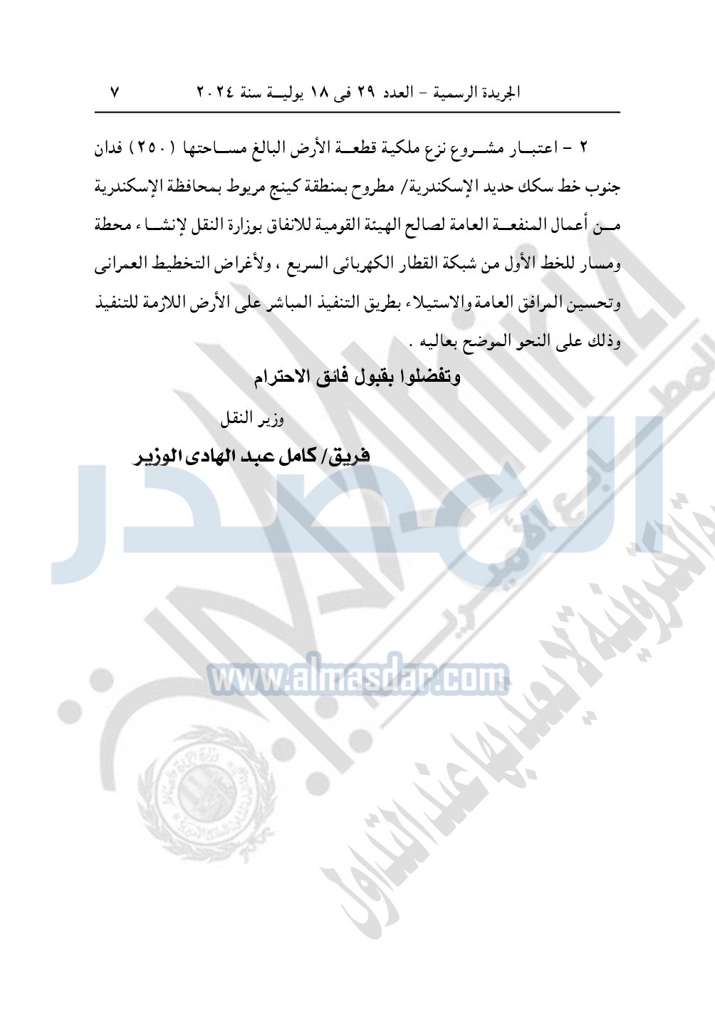 نشرت الجريدة الرسمية في العدد 29، الصادر في 18 يوليو سنة 2024، قرار رئيس مجلس الوزراء رقم 1898 لسنة 2024، بشأن نزع ملكية 250 فدان بالإسكندرية لإنشاء محطة ومسار القطار الكهربائي السريع.