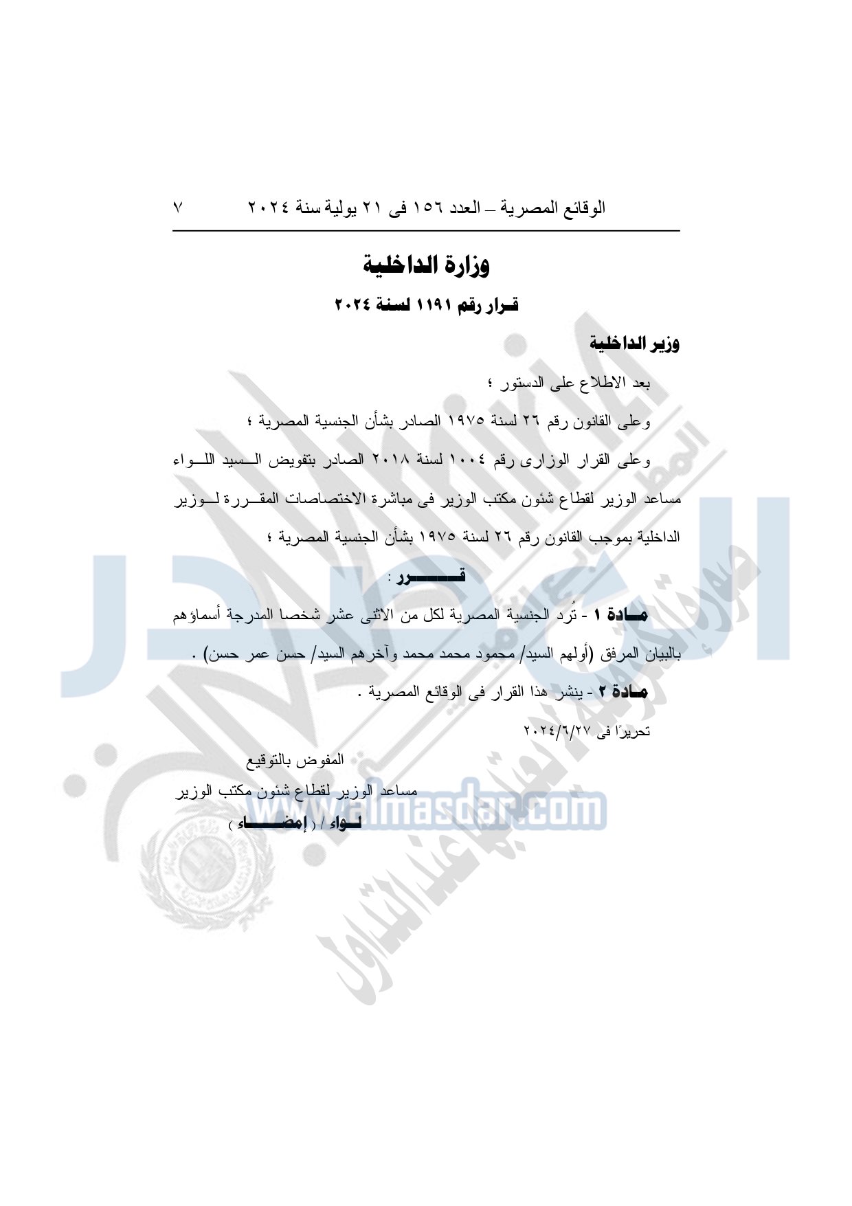 نشرت الوقائع المصرية في العدد 156، الصادر في 21 يوليو سنة 2024، قرار وزارة الداخلية رقم 1191 لسنة 2024، بشأن رد الجنسية المصرية لـ12 مواطن.