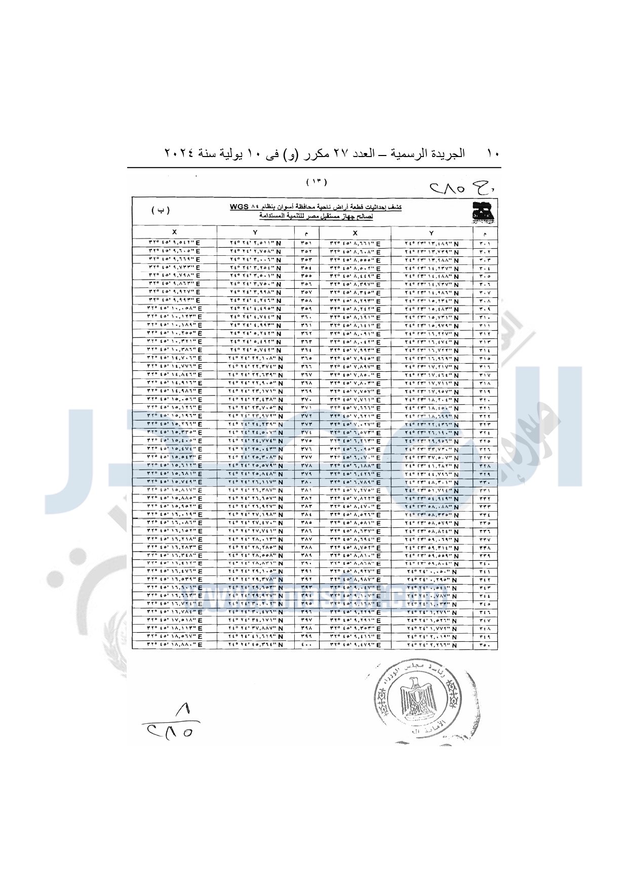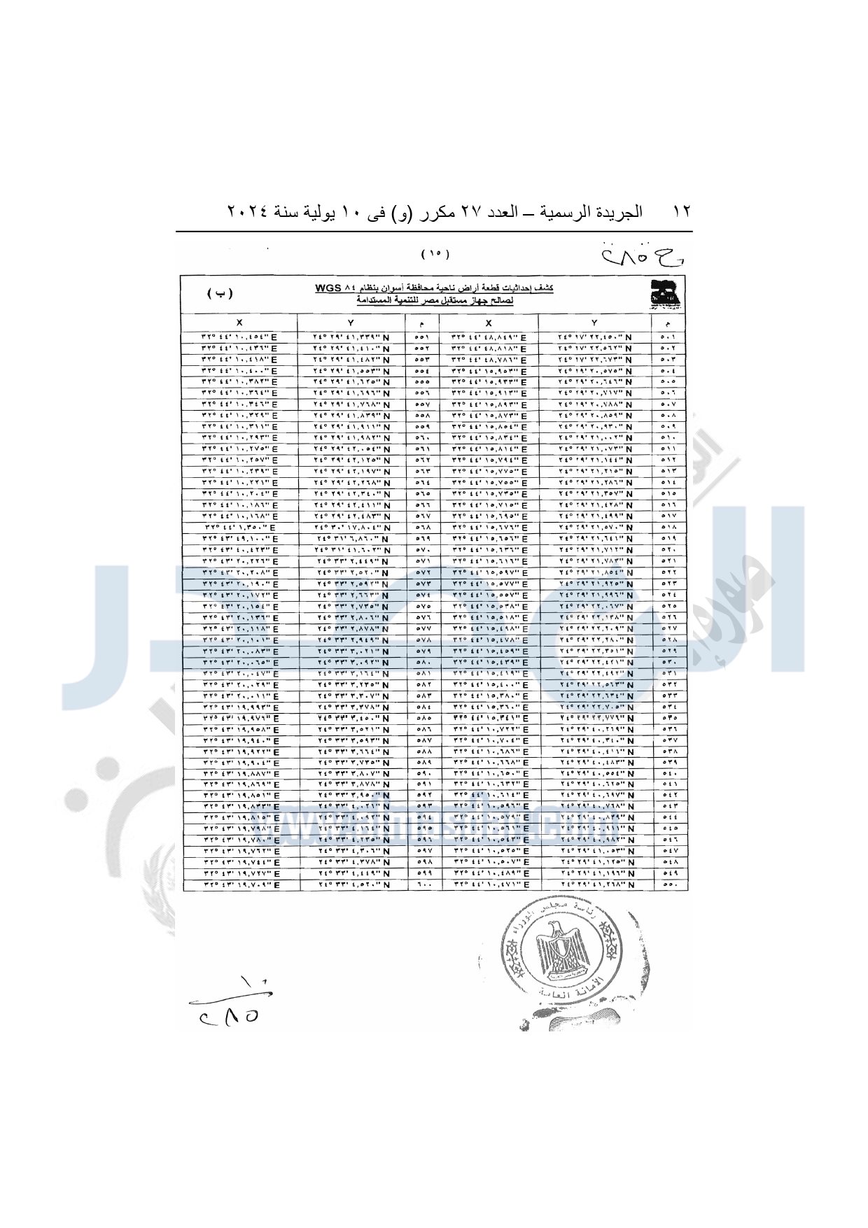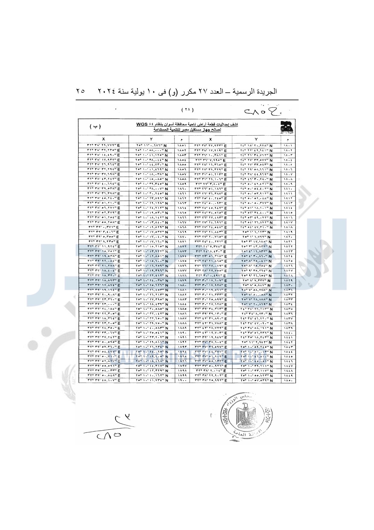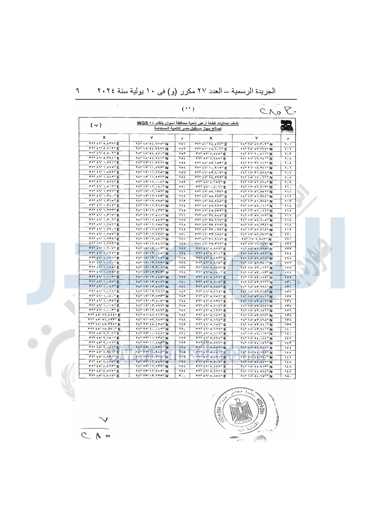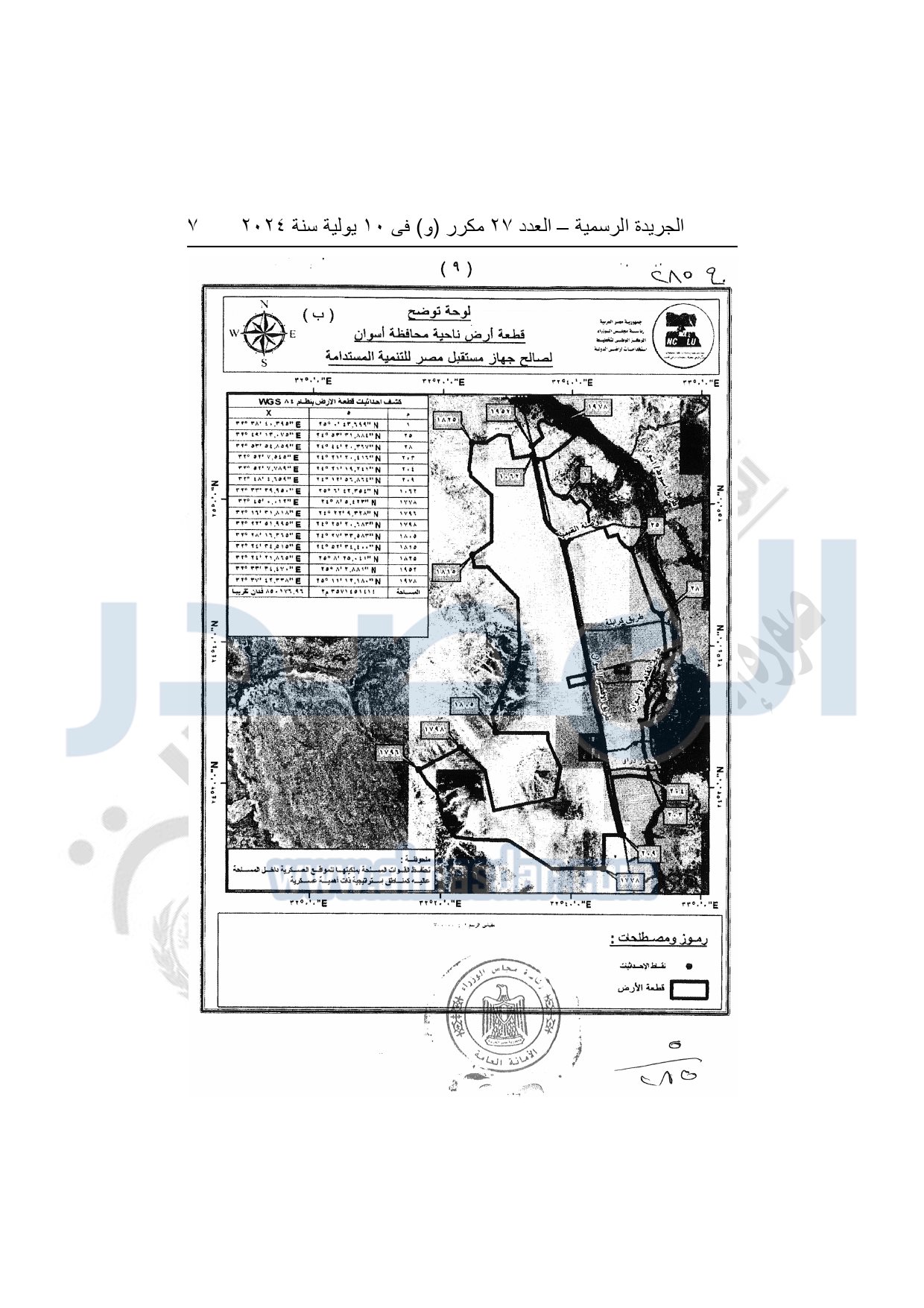 قطعة أرض بمساحة 850176.96 فدان تقريبًا تعادل 3571451414م2 ناحية محافظة أسوان ، وفقا للوحة وجدول الاحداثيات المرفقين ويرمز لها بالحرف "ب".