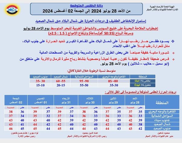 يتوقع خبراء هيئة الأرصاد الجوية، أن يسود غدا الأحد طقس حار رطب نهارا على القاهرة الكبرى والوجه البحري والسواحل الشمالية، شديد الحرارة على جنوب سيناء وجنوب البلاد، بينما يسود طقس مائل للحرارة رطب ليلا على أغلب الأنحاء، معتدل الحرارة رطب على السواحل الشمالية.