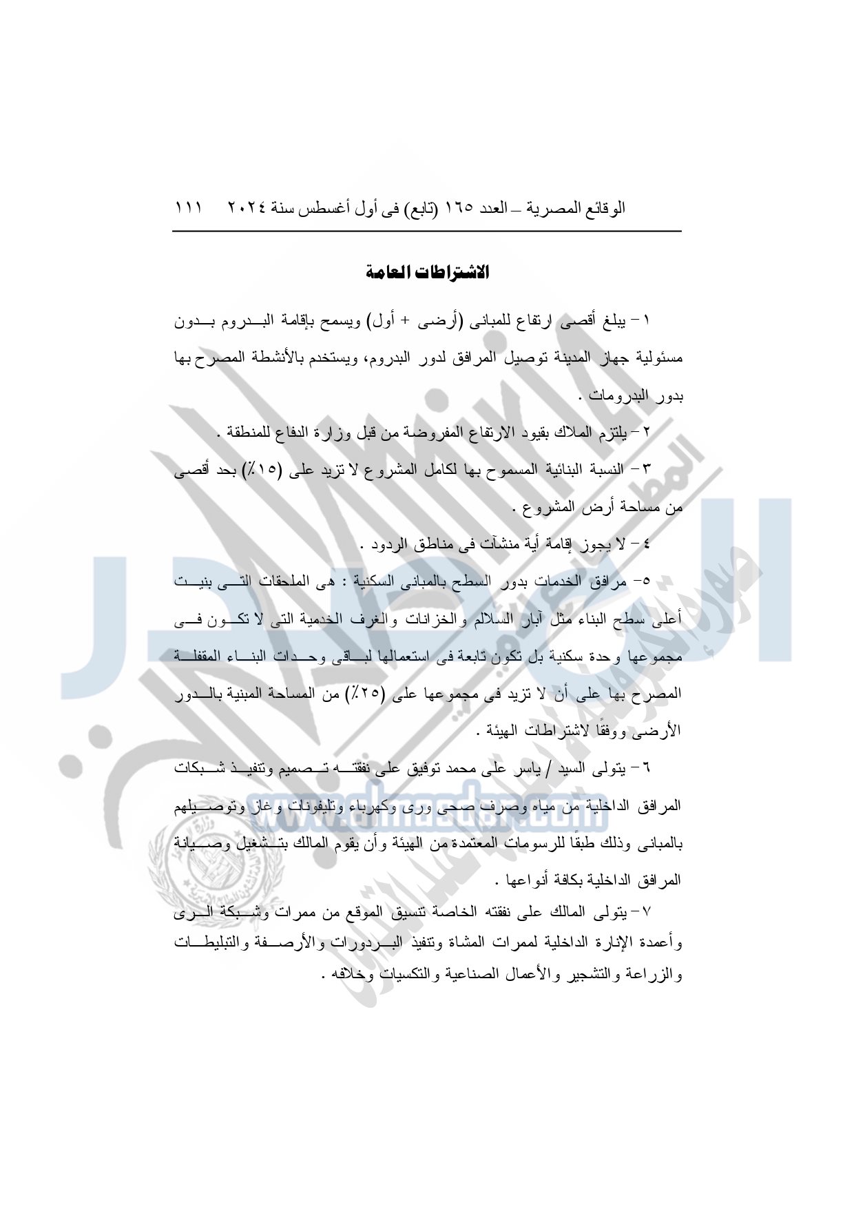 نشرت الوقائع المصرية في العدد 165 "تابع"، في أول أغسطس سنة 2024، قرار وزارة الإسكان والمرافق والمجتمعات العمرانية رقم 200 لسنة 2024، بتاريخ 28-2-2024، بشأن اعتماد تعديل تخطيط وتقسيم الجزء غير المنمى من قطعة الأرض رقم "24أ / 1" بمساحة 2.5 فدان بما يعادل 10500م2 الواقعة بالحوض رقم "3" بمنطقة الحزام الأخضر بمدينة الشيخ زايد المخصصة لياسر على محمد توفيق بمقابل عينى "تنازل عن 50%" لإقامة نشاط سكنى وكذا نشاط "تجارى" بعلاوة سعرية وتخديمها من الخارج السابق صدور القرار الوزارى لها رقم 189 لسنة 2022 باعتماد تخطيطها وتقسيمها.