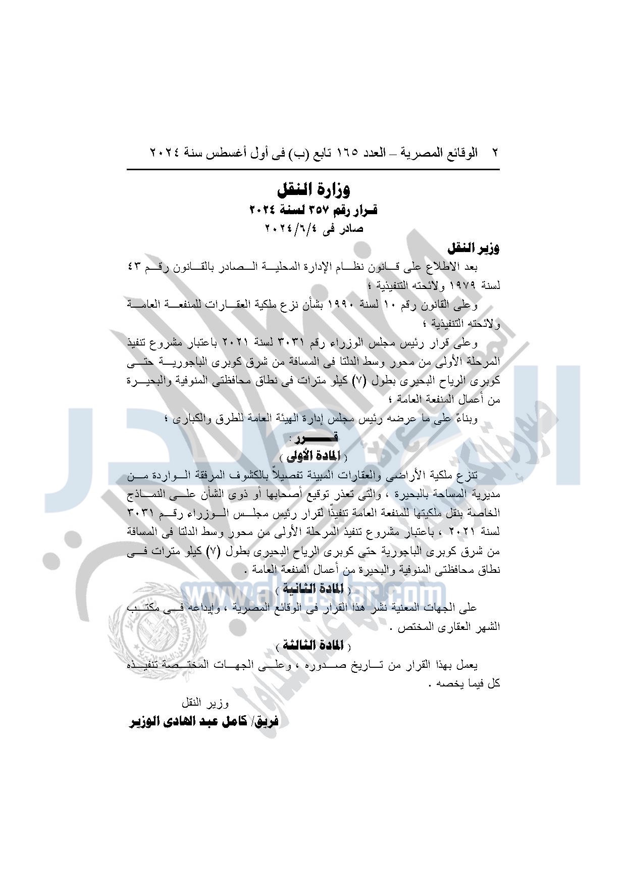 نشرت الوقائع المصرية في العدد 165 تابع "ب"، في أول أغسطس 2024، قرار وزارة النقل رقم 357 لسنة 2024، صادر في 4-6-2024، بشأن نزع ملكية بعض الأراضي والعقارات لتنفيذ المرحلة الأولى من محور وسط الدلتا.