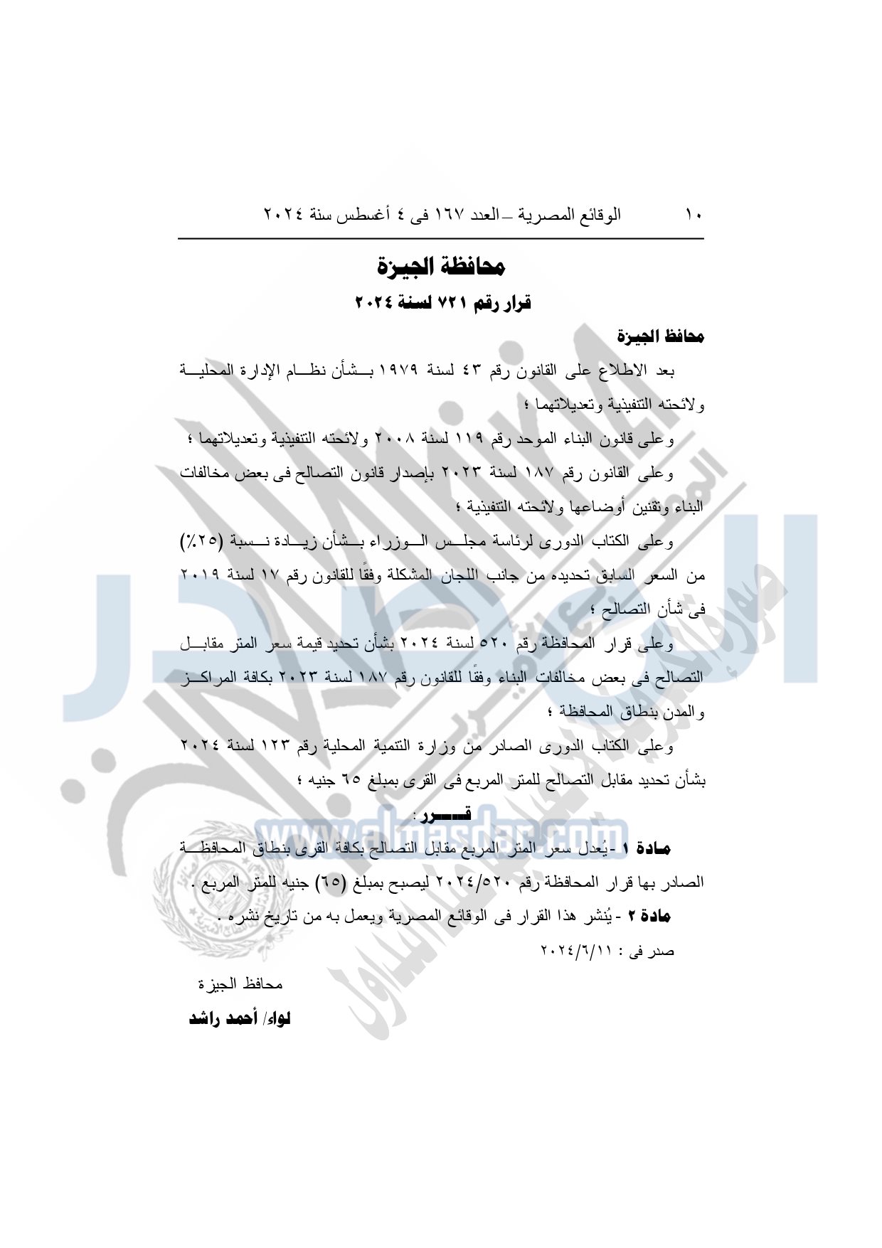 نشرت الوقائع المصرية في العدد 167، بتاريخ 4 أغسطس 2024، قرار محافظة الجيزة رقم 721 لسنة 2024، بشأن تعديل سعر المتر المربع مقابل التصالح في مخالفات البناء بكافة القرى بنطاق المحافظة.
