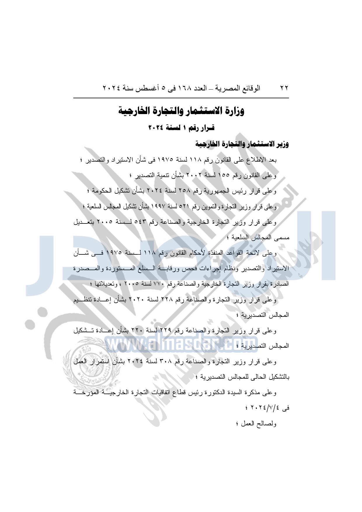 وأوضحت الوقائع المصرية، أن القرار جاء بعد الاطلاع على القانون رقم 118 لسنة 1975 في شأن الاستيراد والتصدير؛ وعلى القانون رقم 155 لسنة 2002 بشأن تنمية التصدير؛ وعلى قرار رئيس الجمهورية رقم 258 لسنة 2024 بشأن تشكيل الحكومة؛ وعلى قرار وزير التجارة والتموين رقم 521 لسنة 1997 بشأن تشكيل المجالس السلعية؛ وعلى قرار وزير التجارة الخارجية والصناعة رقم 543 لسنة 2005 بتعديل مسمى المجالس السلعية.