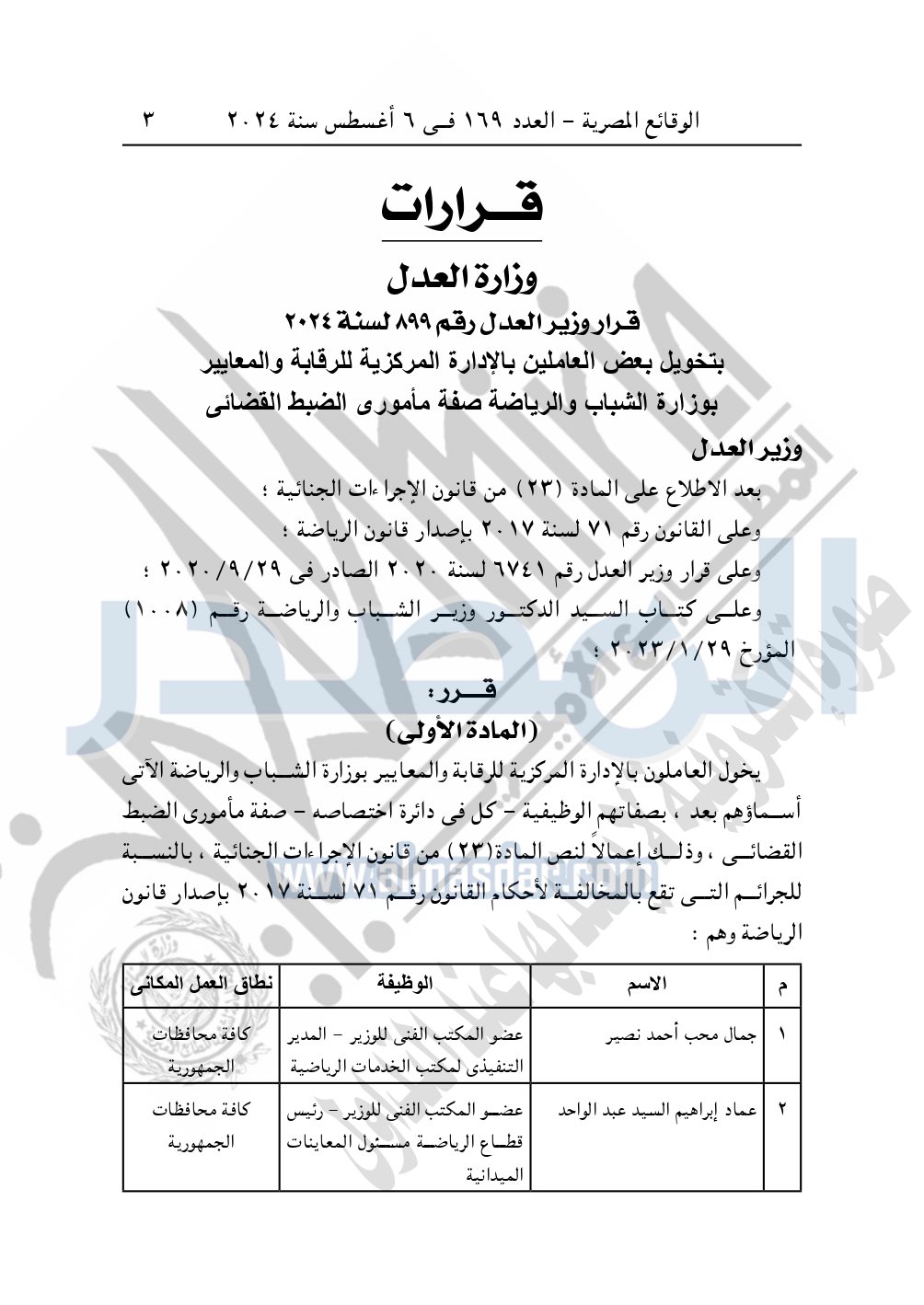نشرت الوقائع المصرية في العدد 169، الصادر في 6 أغسطس سنة 2024، قرار وزارة العدل رقم 899 لسنة 2024، بشأن تخويل بعض العاملين بالإدارة المركزية للرقابة والمعايير بوزارة الشباب والرياضة صفة مأموري الضبط القضائي.