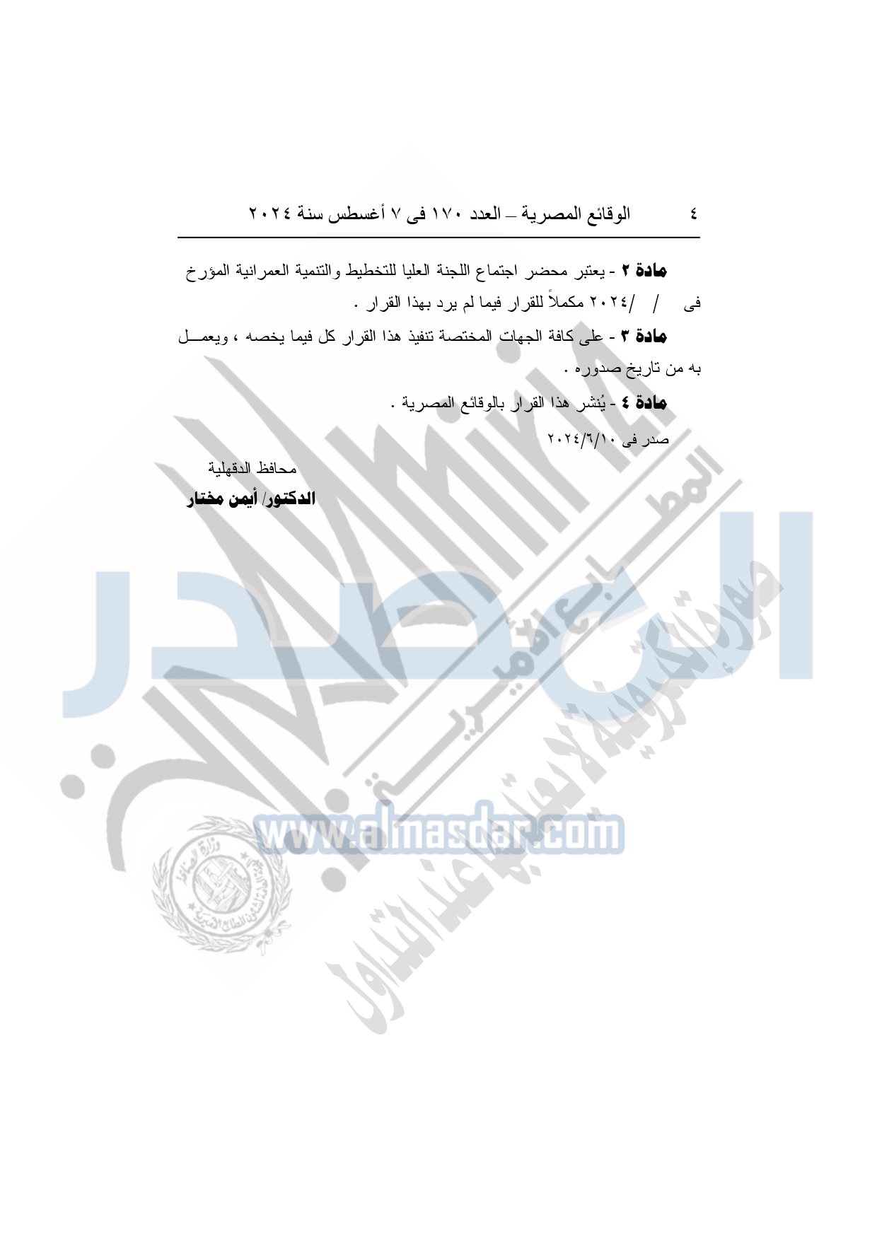 نشرت الوقائع المصرية في العدد 170، الصادر في 7 أغسطس سنة 2024، قرار محافظة الدقهلية رقم 641 لسنة 2024، بشأن تعديل المخططات التفصيلية لمدينة دكرنس.
